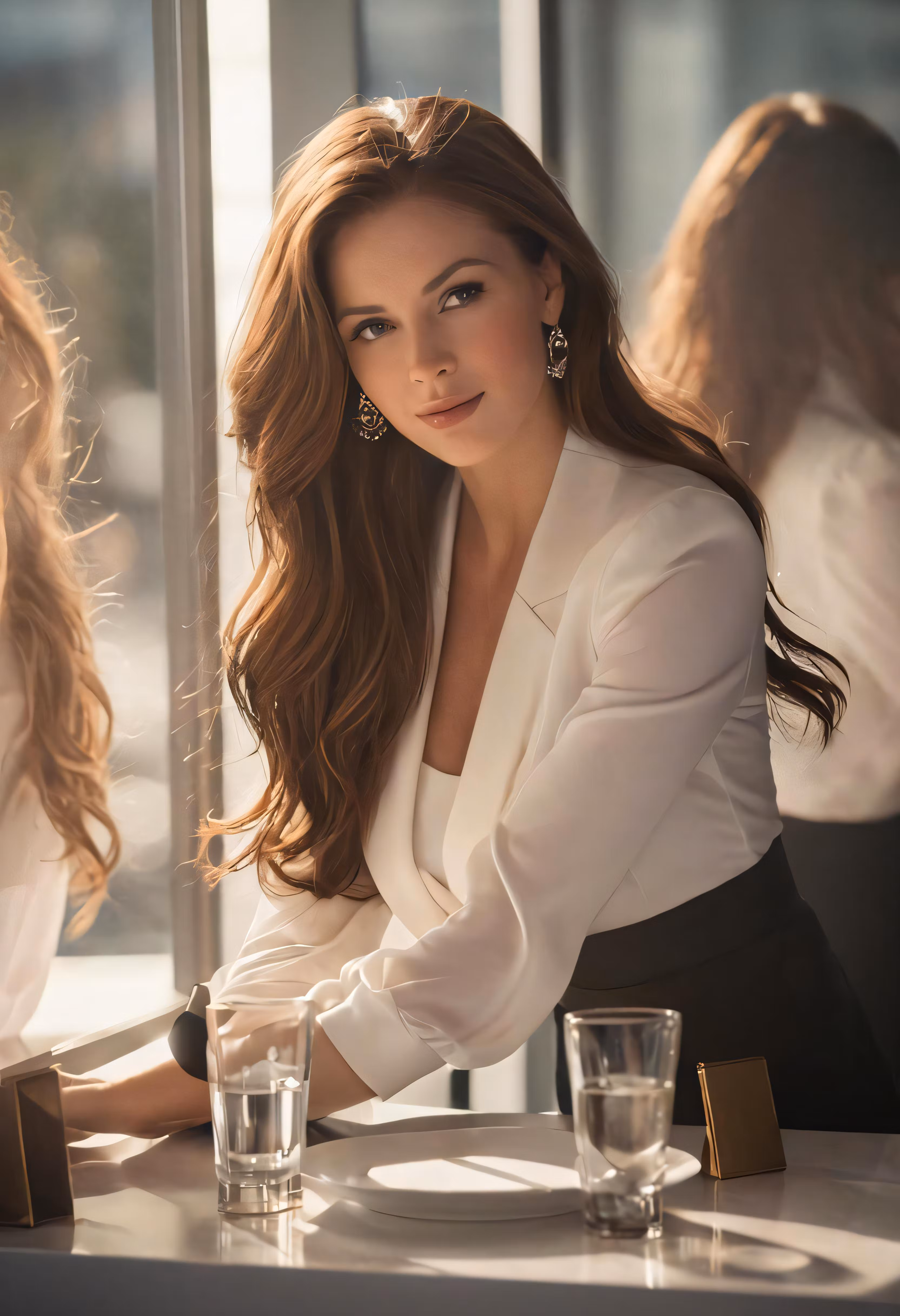 High resolution picture, free to use, a beautiful woman sitting at a table with two glasses