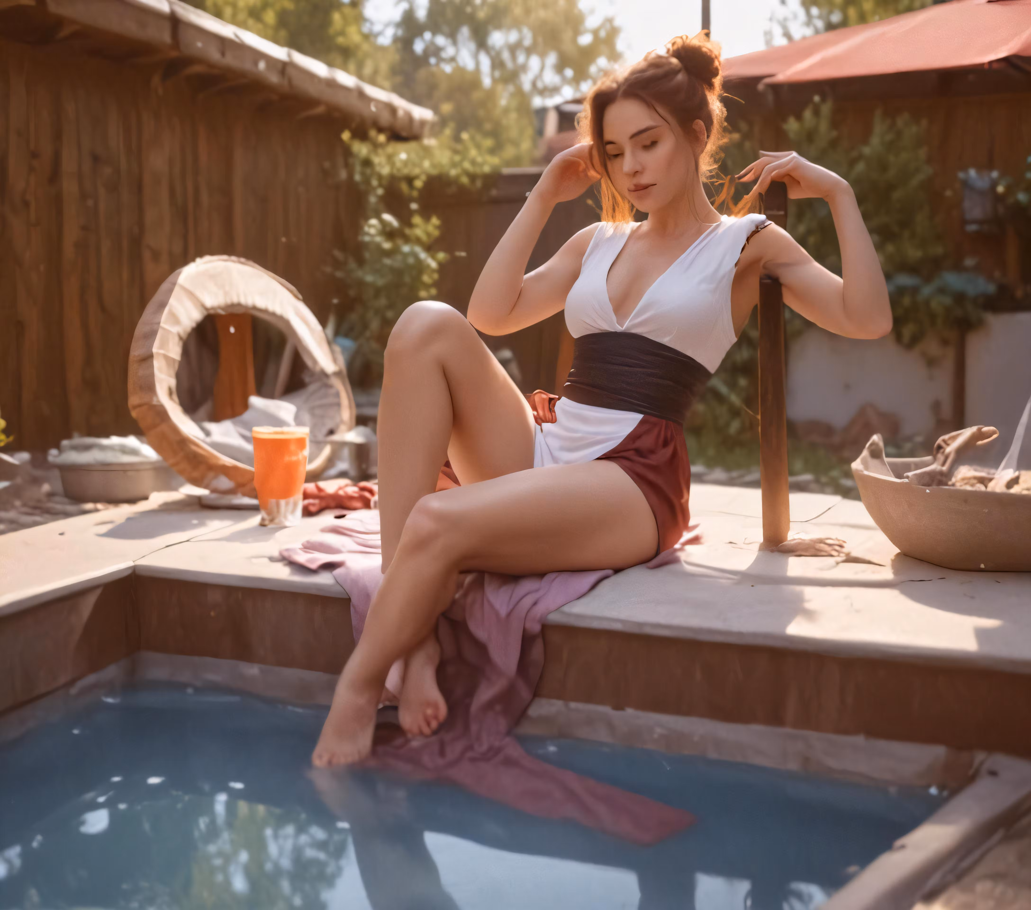 High resolution picture, free to use, a beautiful woman sitting on a ledge near a pool