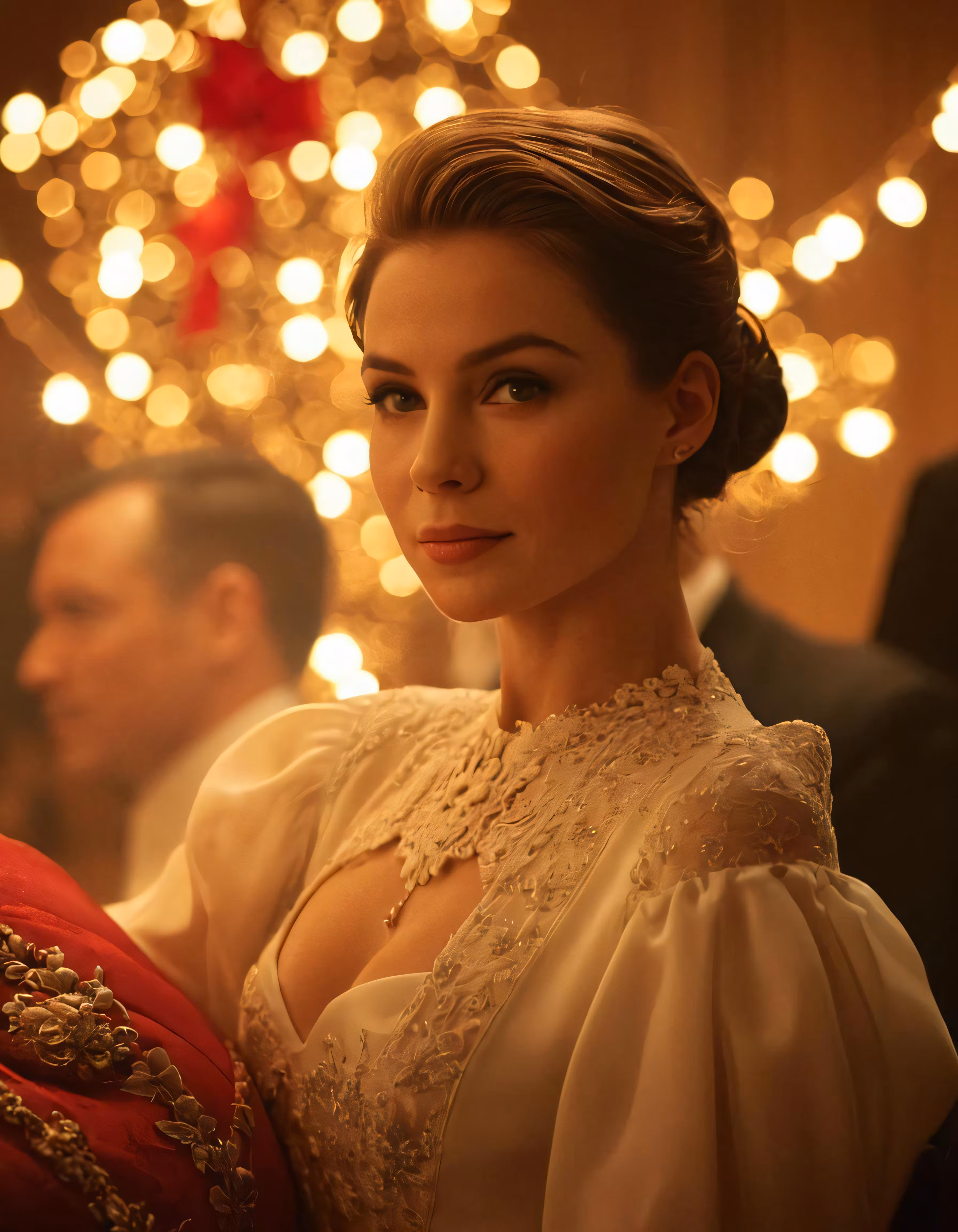 High resolution picture, free to use, a beautiful woman standing in front of a christmas tree