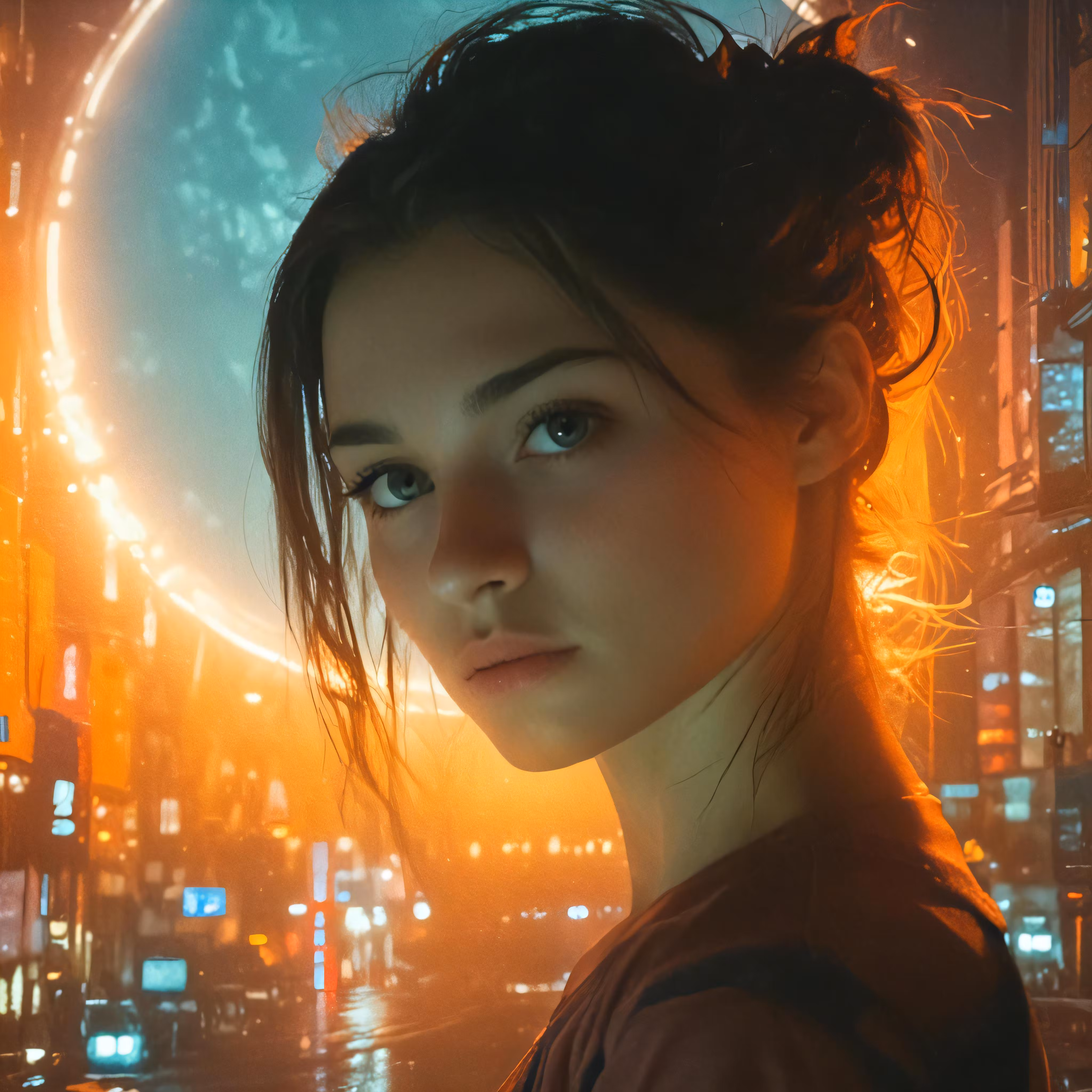 High resolution picture, free to use, a beautiful woman standing in the middle of a city at night