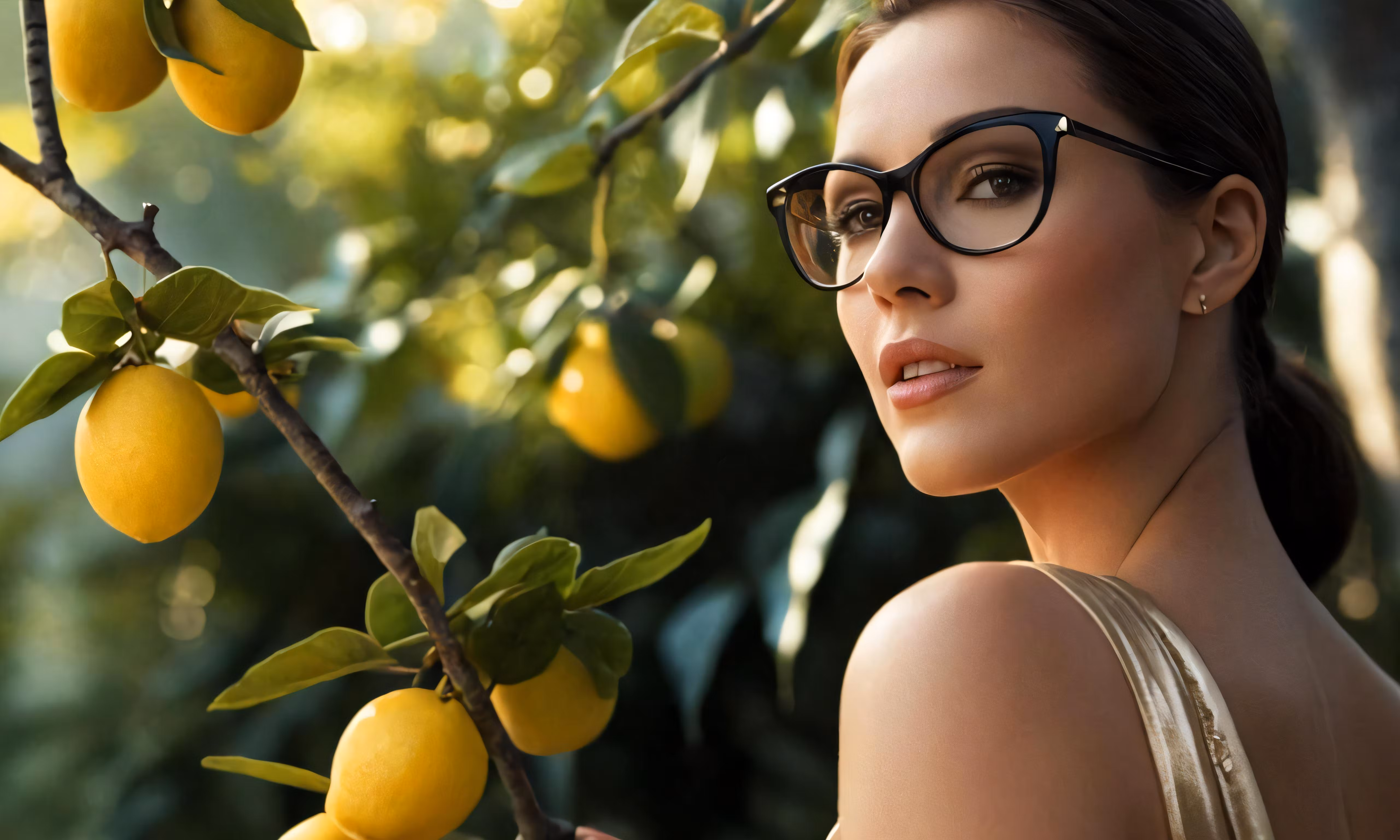 High resolution picture, free to use, a beautiful woman standing next to a tree full of lemons