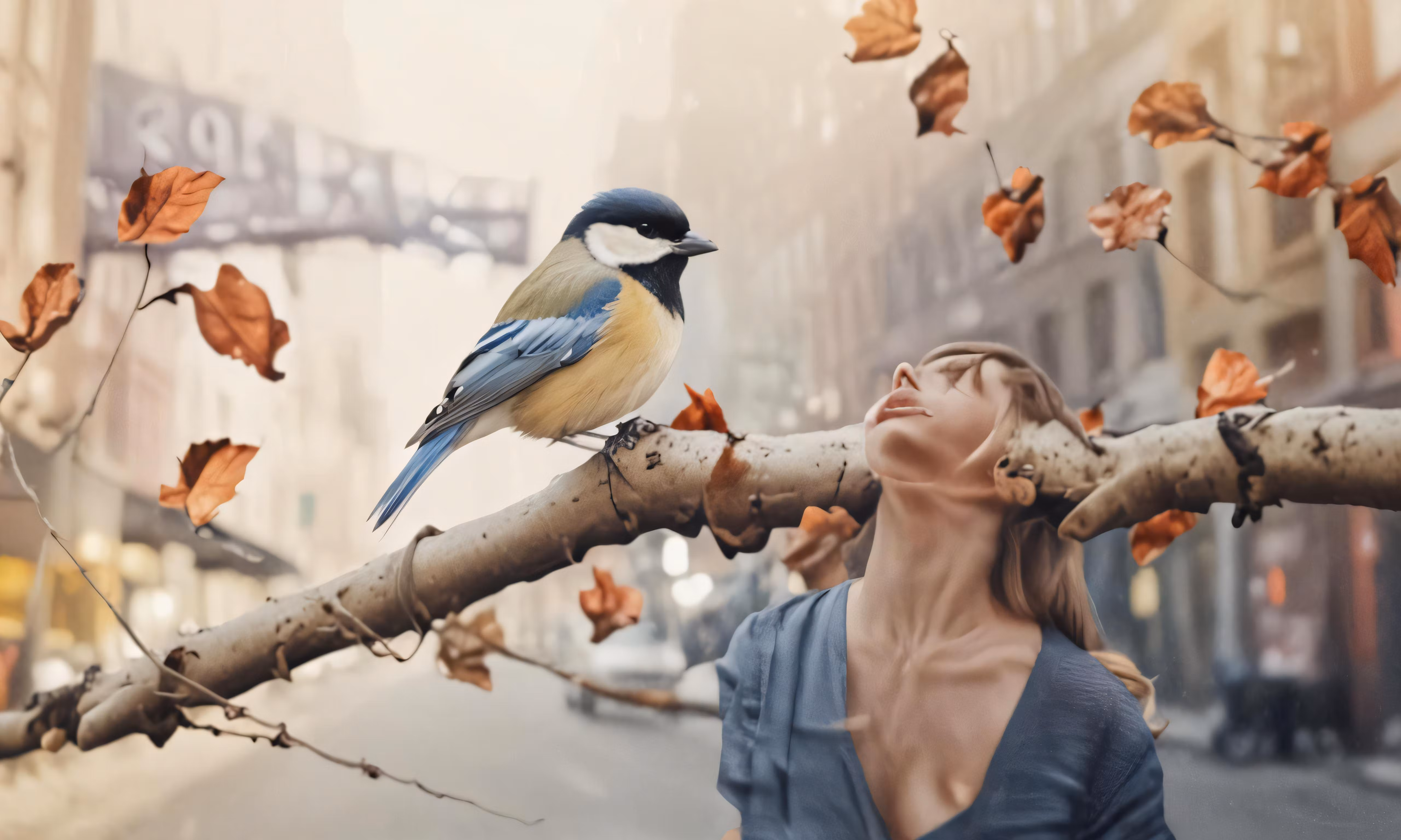 High resolution picture, free to use, a beautiful woman stands on the branch in front of a bird