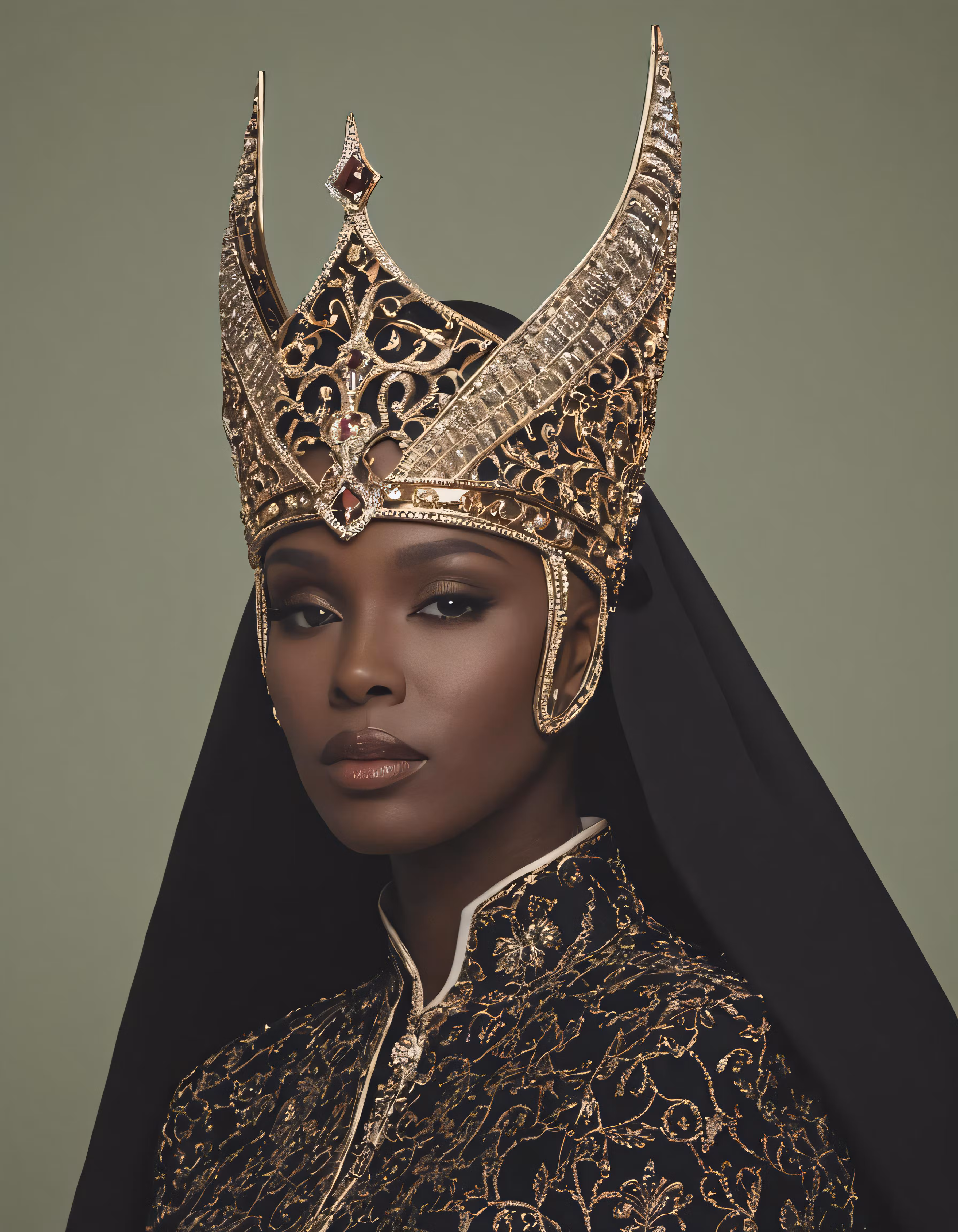 High resolution picture, free to use, a beautiful woman wearing a black and gold crown