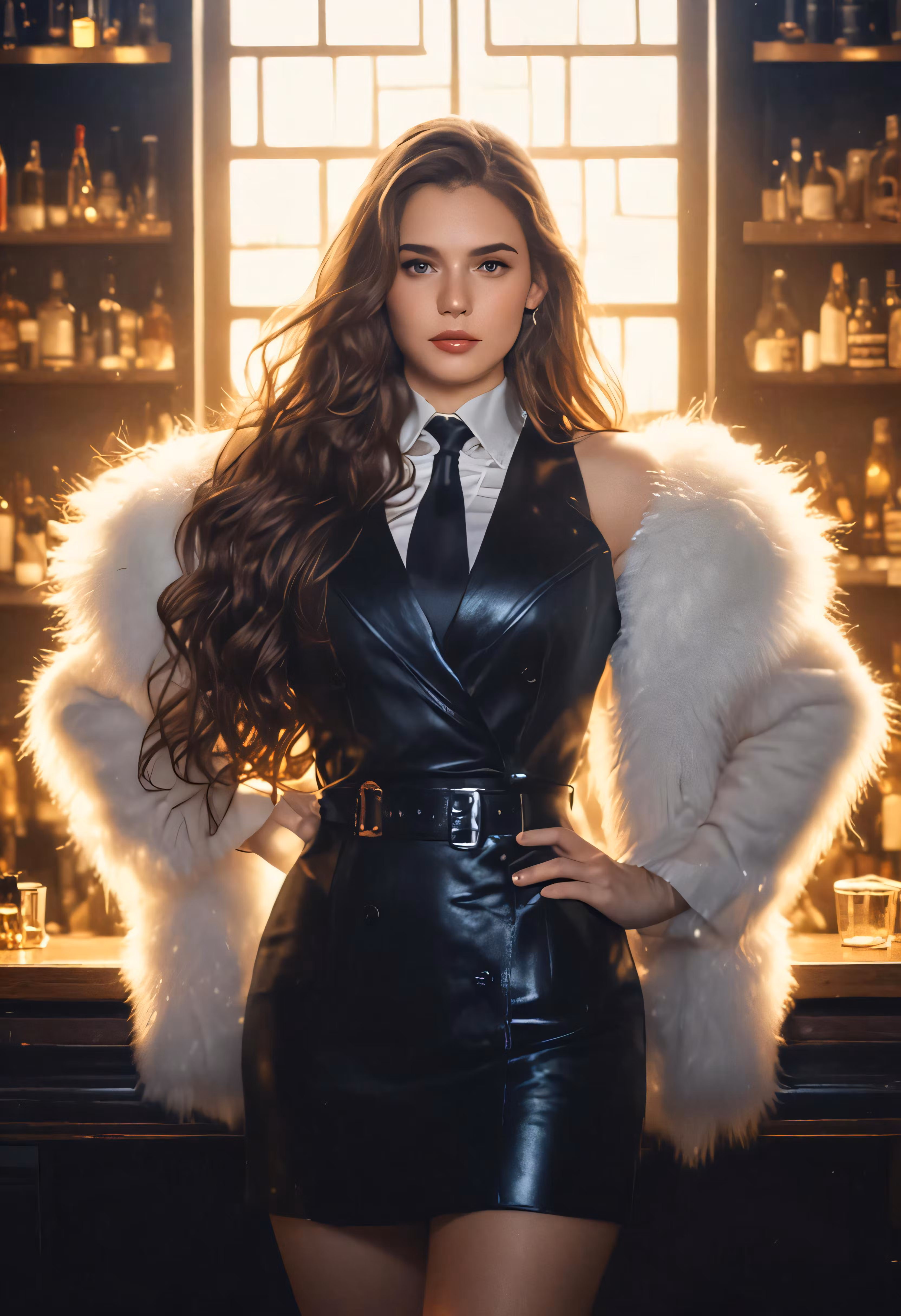 High resolution picture, free to use, a beautiful woman wearing a black dress and a fur coat