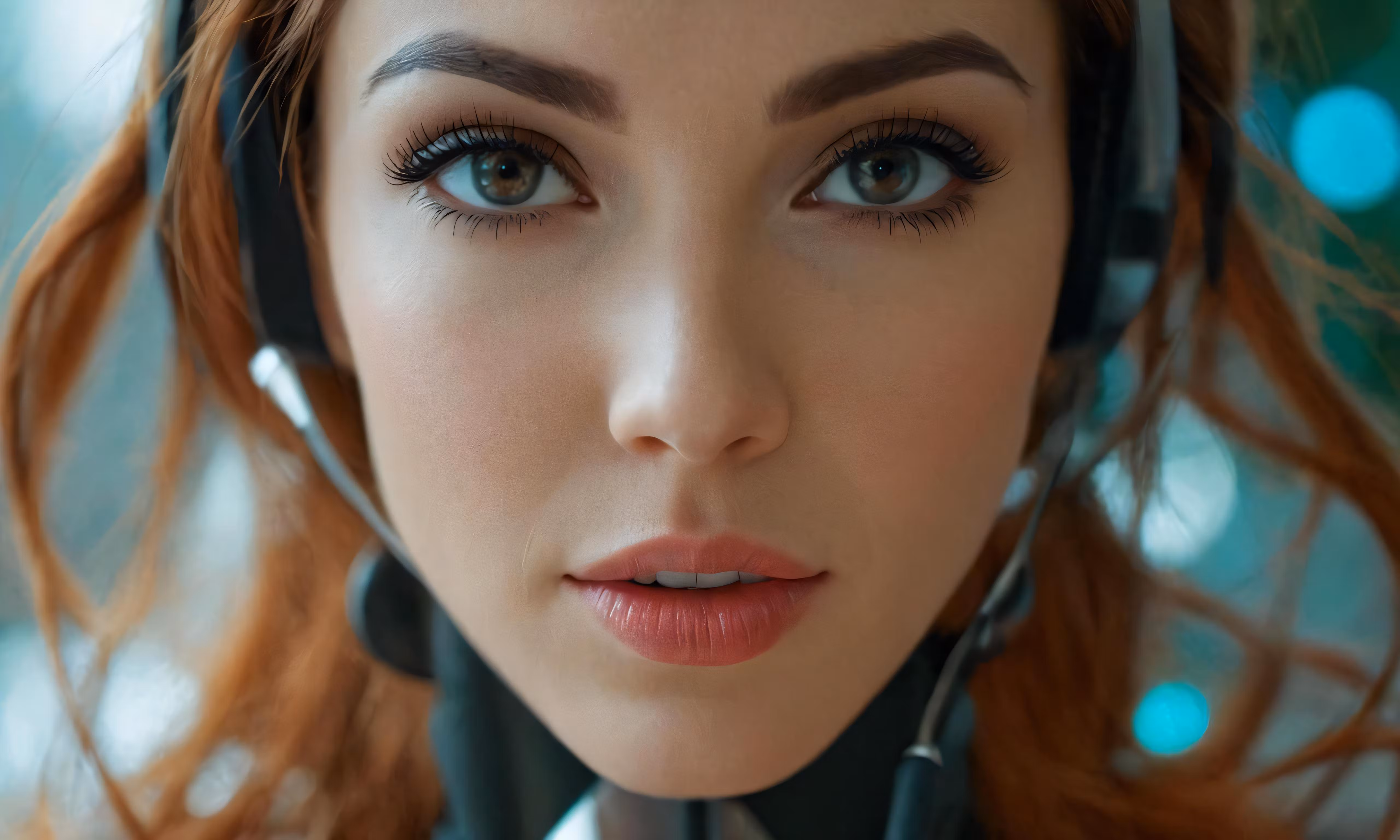 High resolution picture, free to use, a beautiful woman wearing headphones in a futuristic area