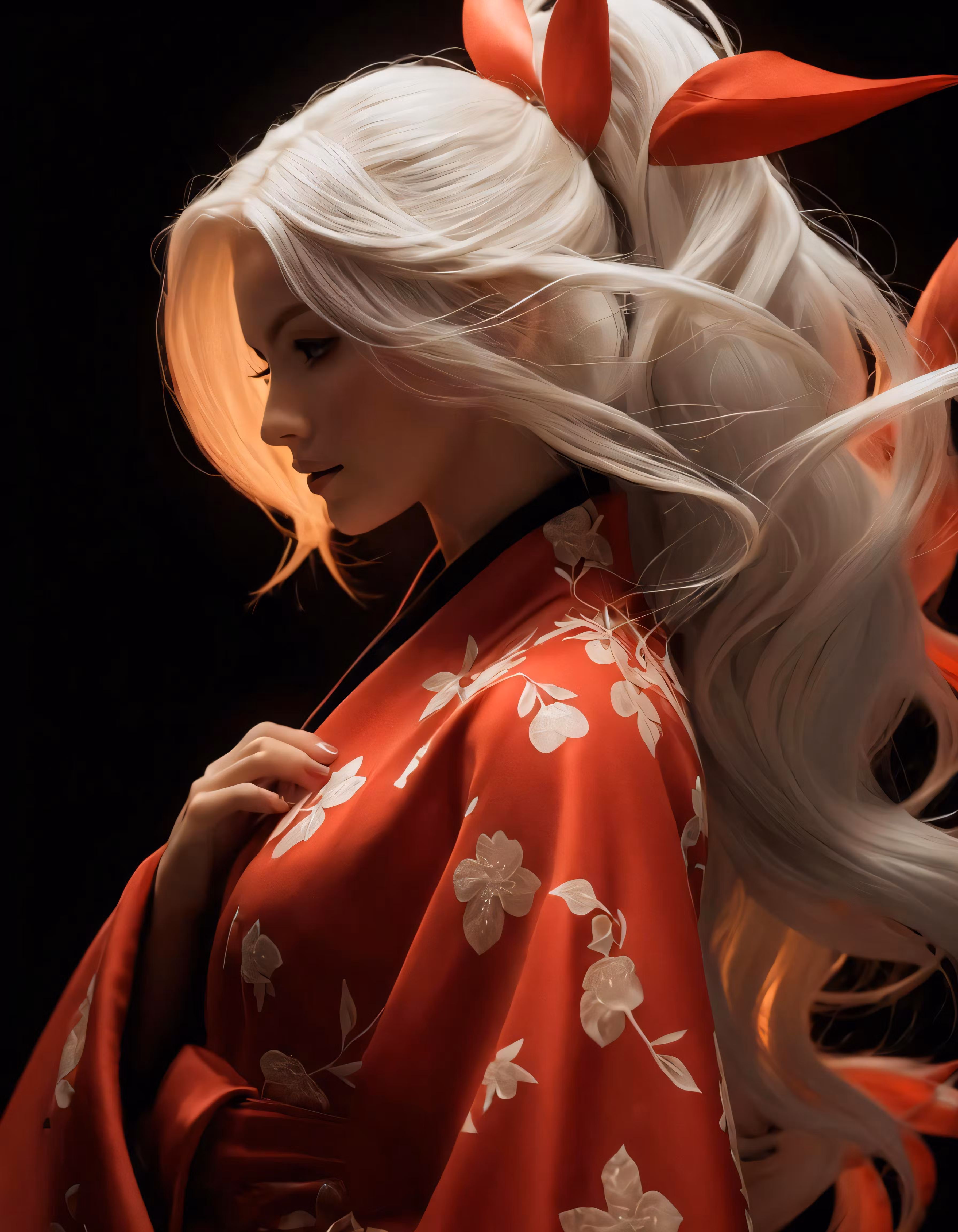 High resolution picture, free to use, a beautiful woman wearing red with long white hair