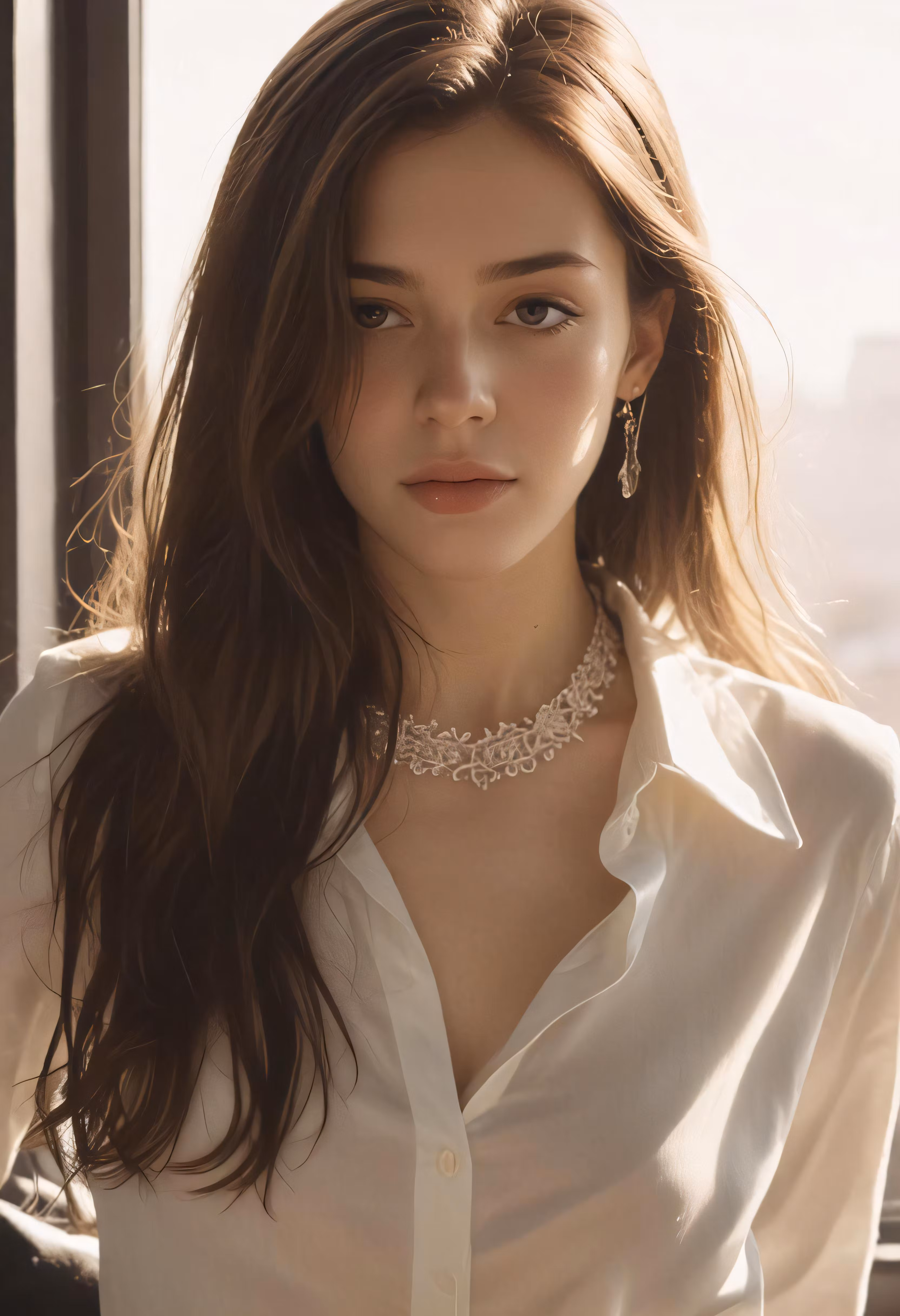 High resolution picture, free to use, a beautiful woman with a collared shirt on in front of a window