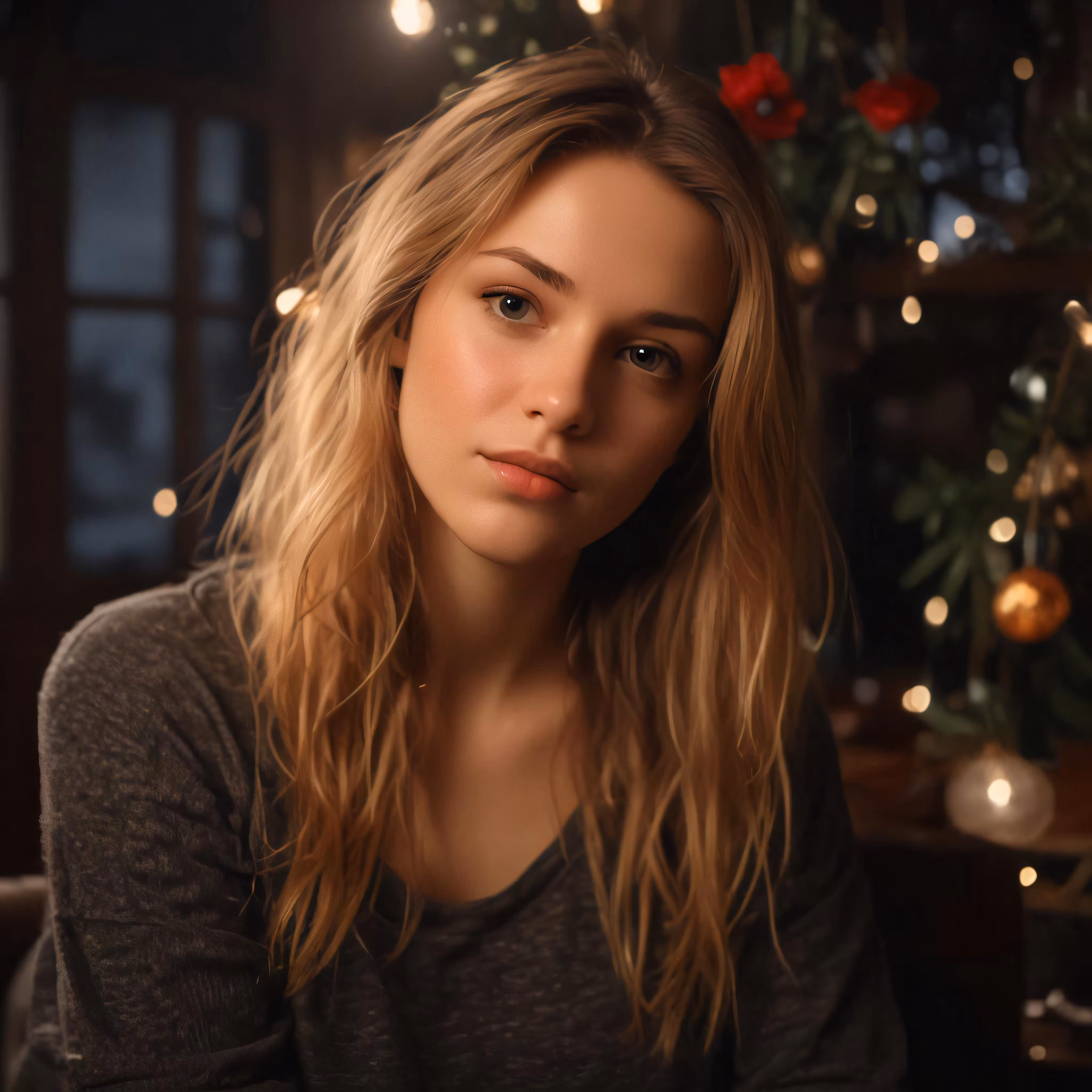 High resolution picture, free to use, a beautiful young blonde woman sitting in front of christmas lights