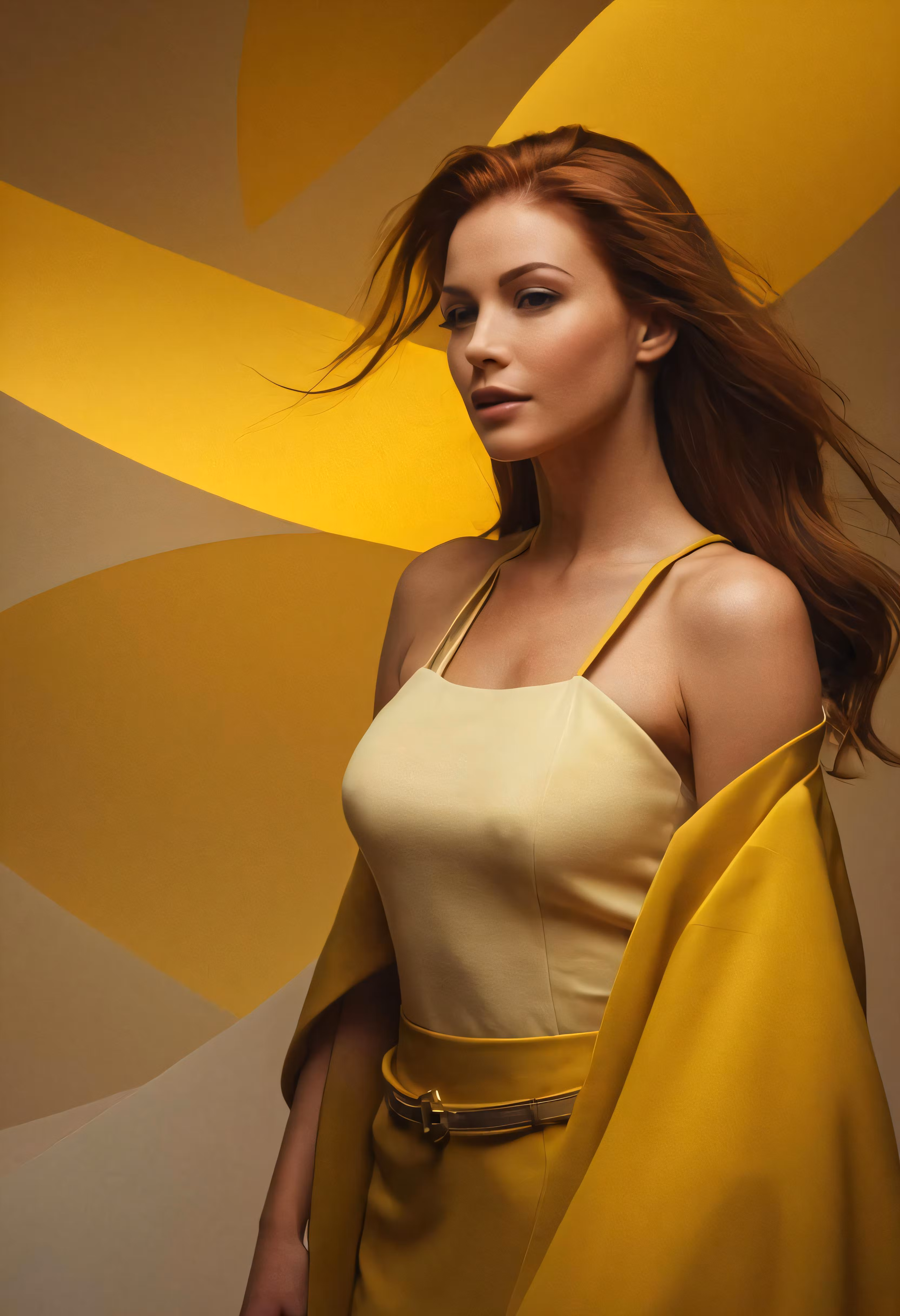High resolution picture, free to use, a beautiful young lady in a yellow dress poses for a magazine photo