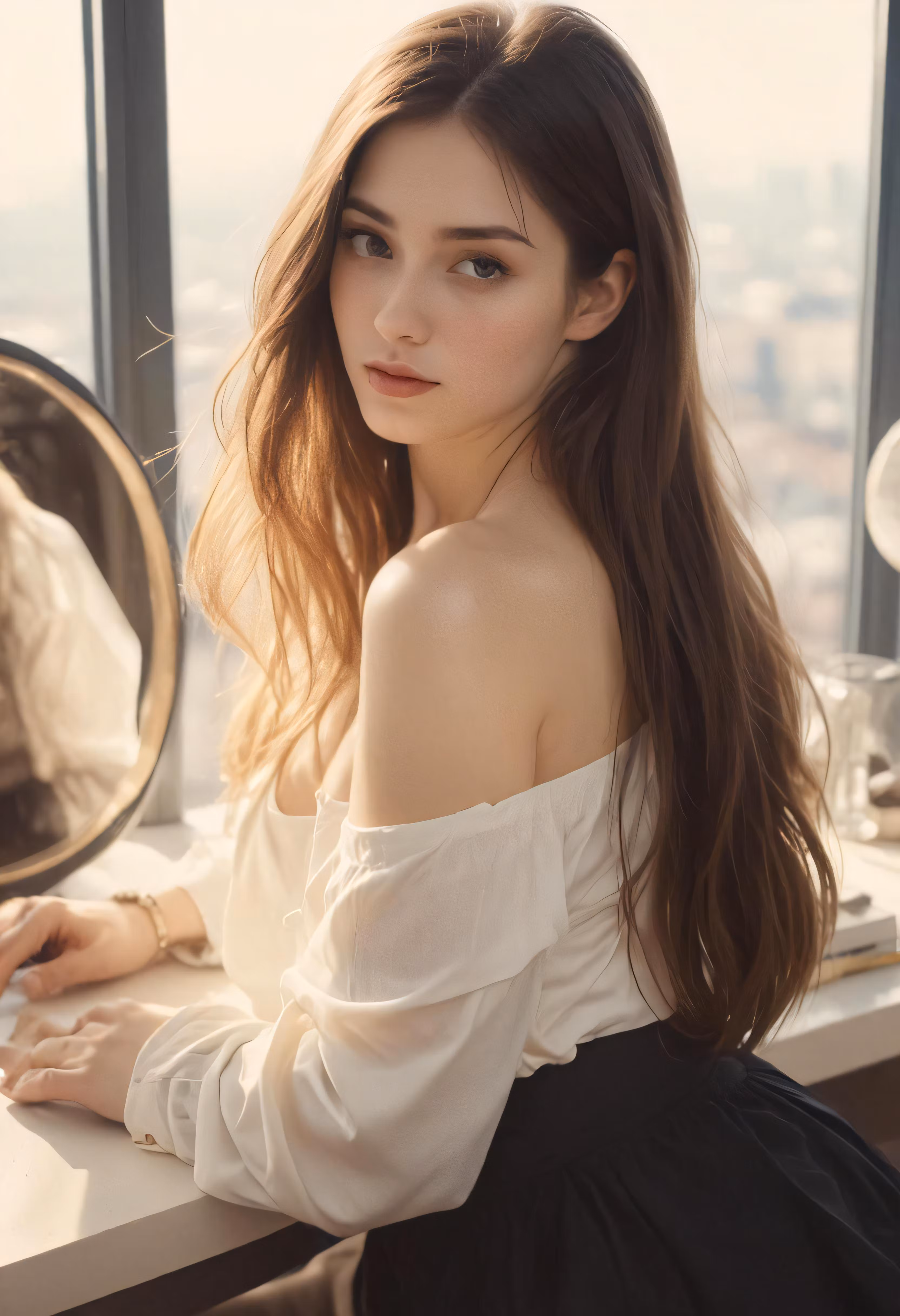 High resolution picture, free to use, a beautiful young lady sitting in front of a mirror