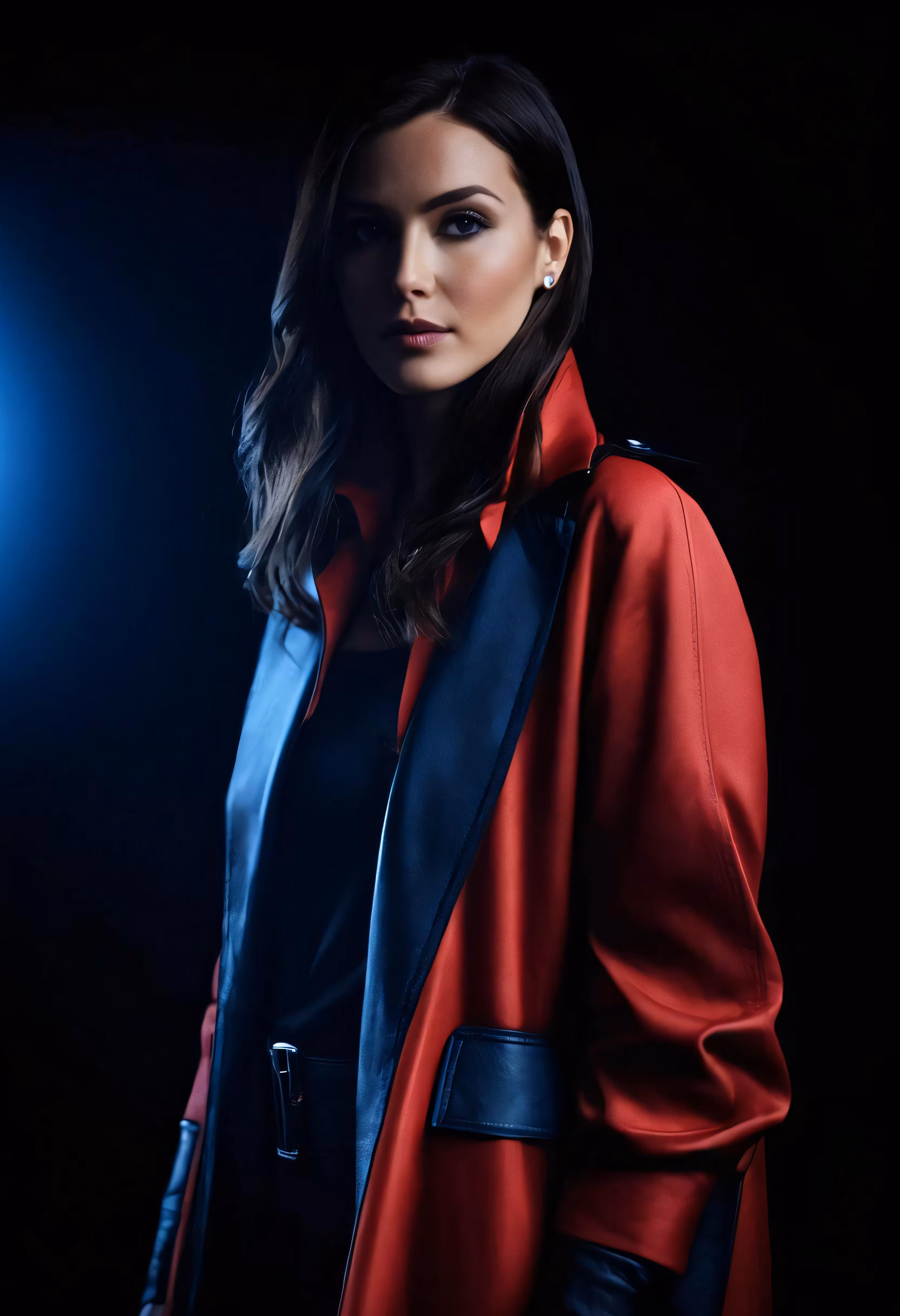 High resolution picture, free to use, a beautiful young lady wearing a red coat with a black shirt and black pants