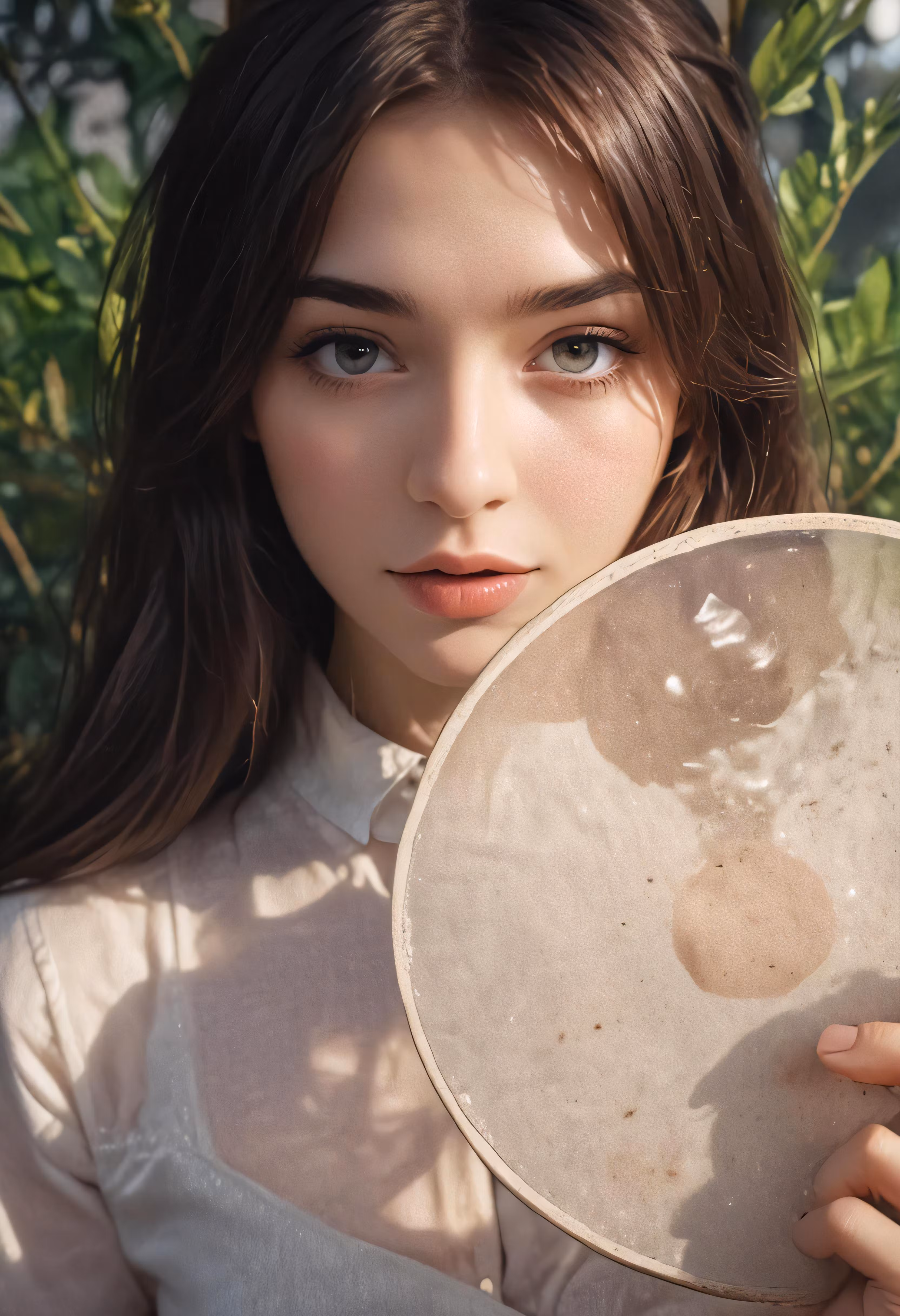 High resolution picture, free to use, a beautiful young woman holding up a circular plate