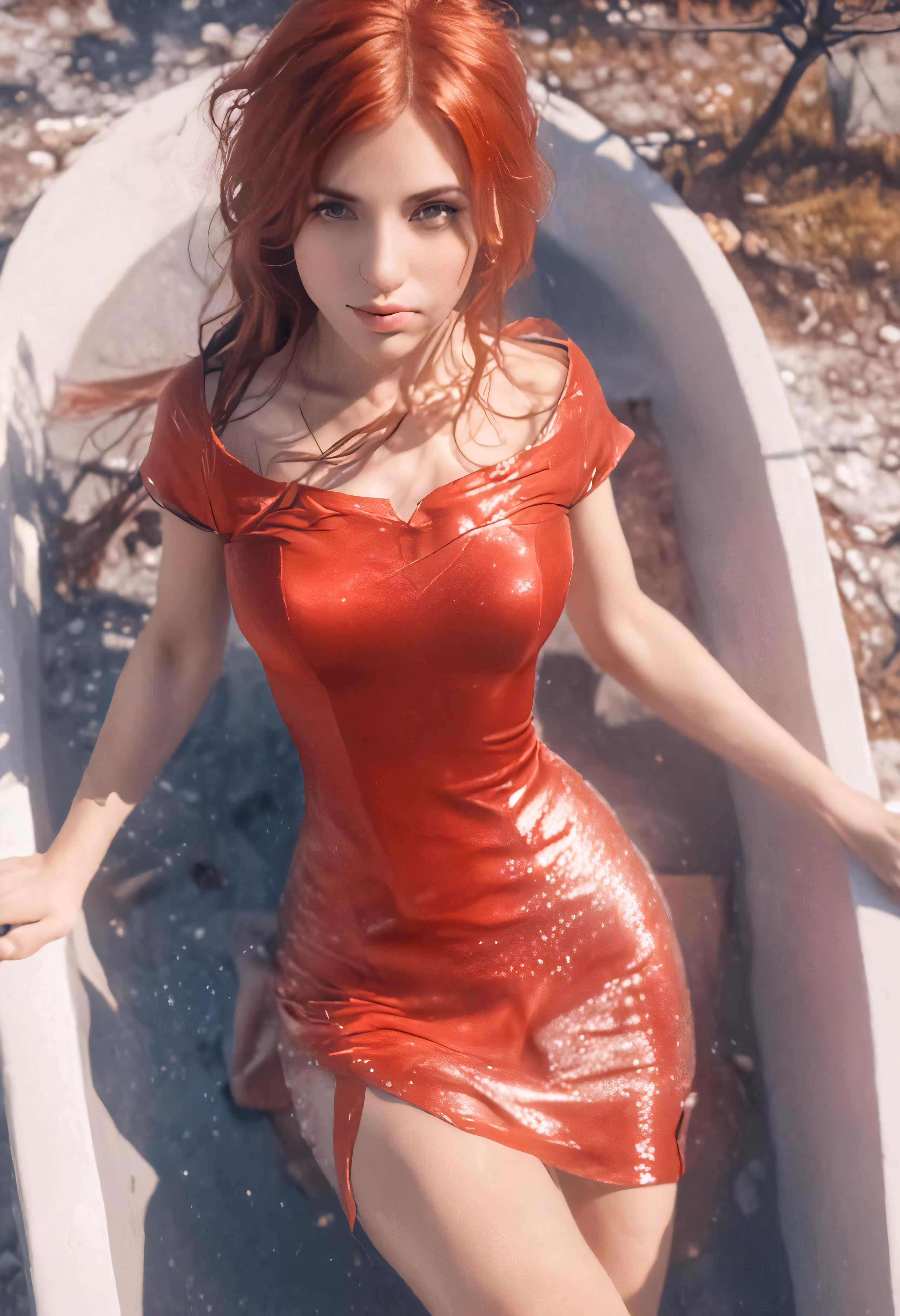 High resolution picture, free to use, a beautiful young woman in red wearing an orange dress