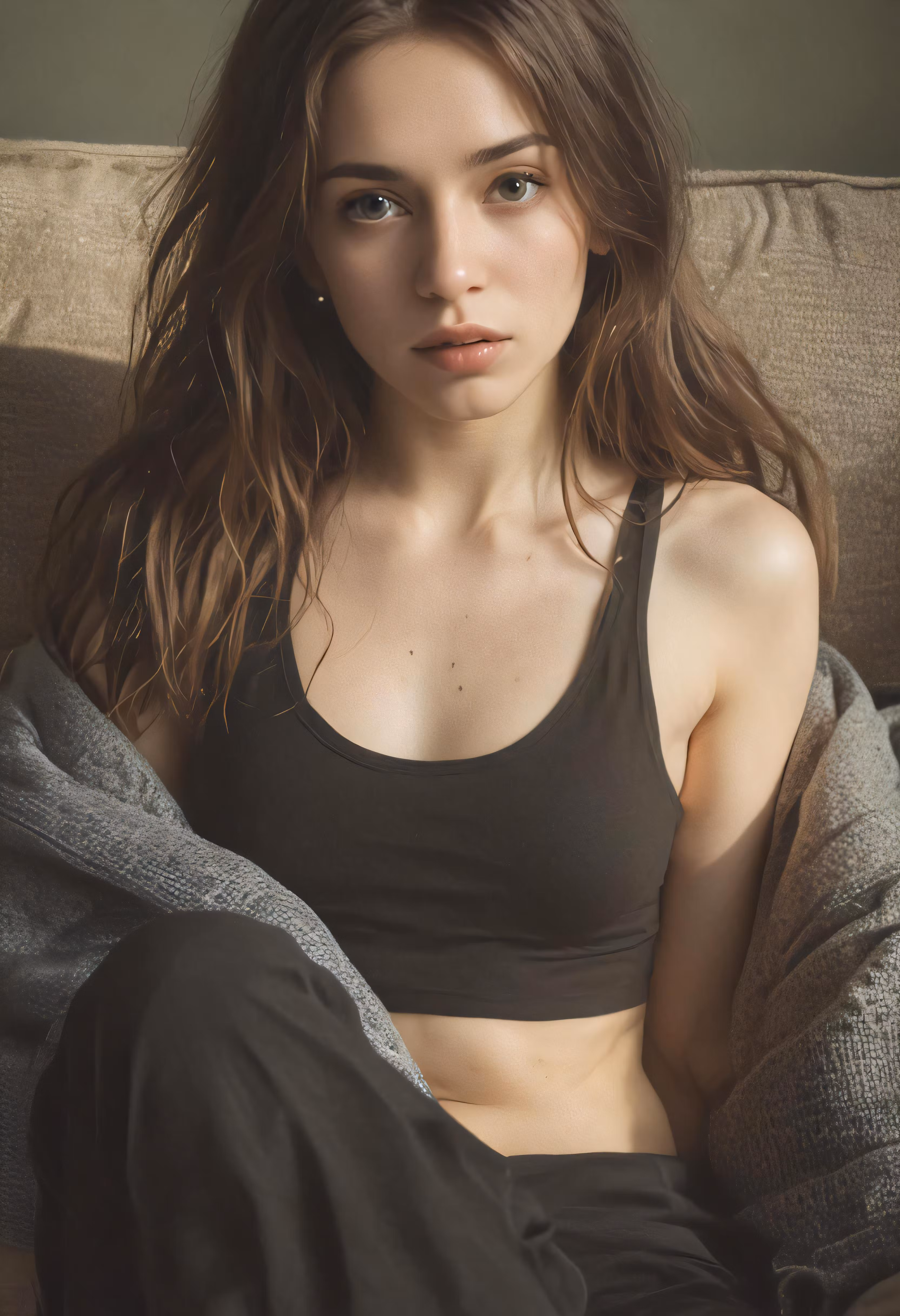 High resolution picture, free to use, a beautiful young woman laying on a couch in a black bra top
