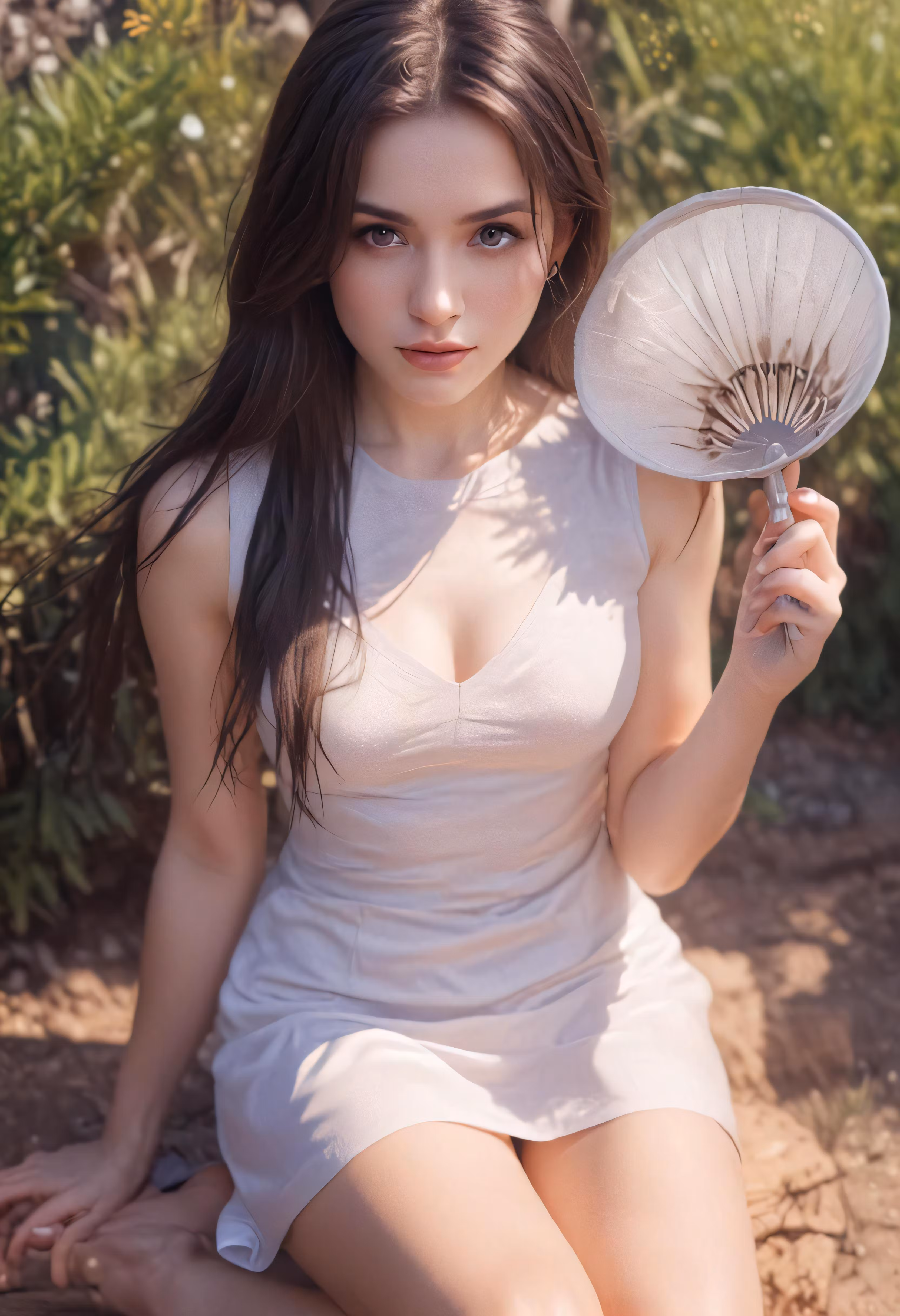 High resolution picture, free to use, a beautiful young woman sitting down and holding a dandelion