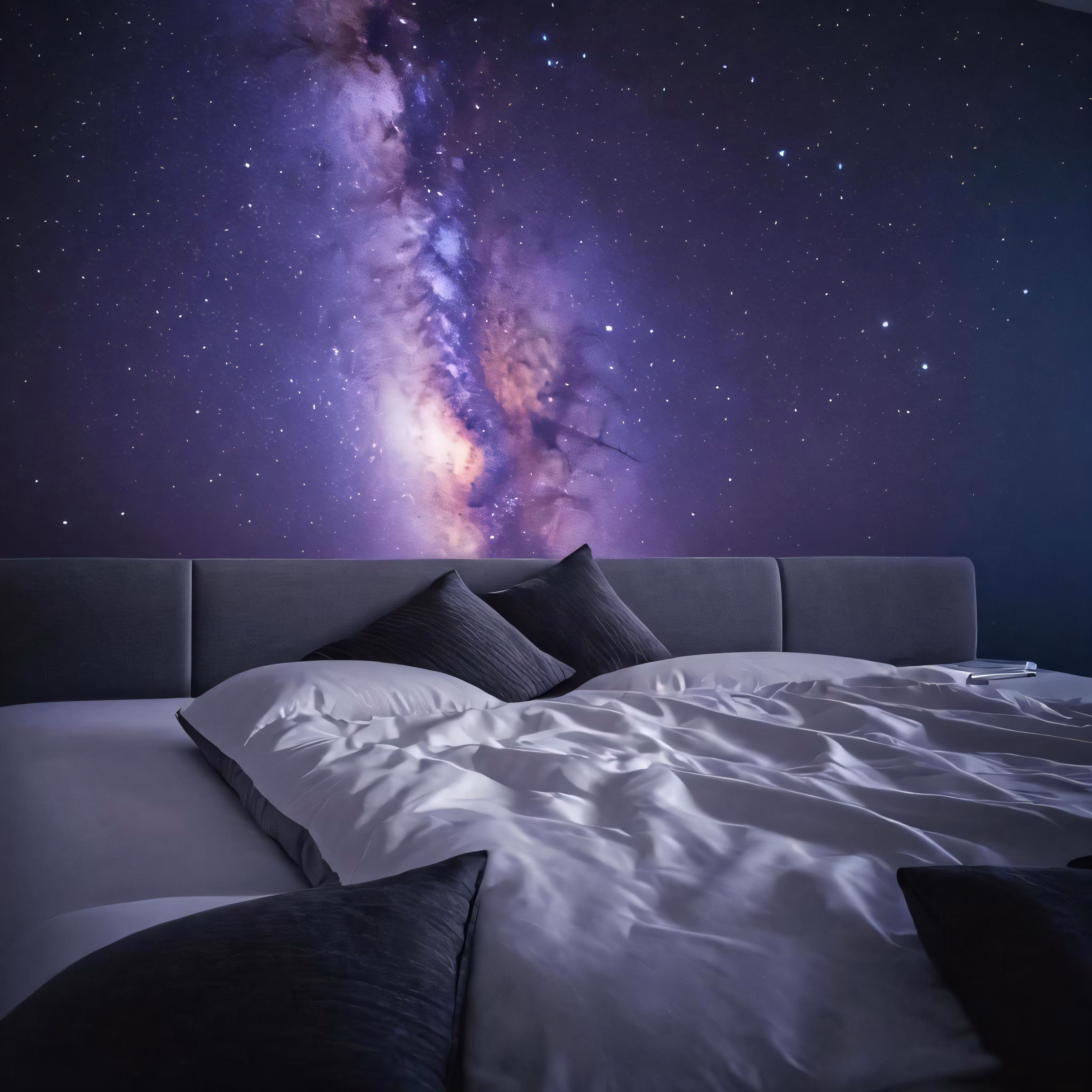 High resolution picture, free to use, a bed with pillows, blanket and wall mural in purple