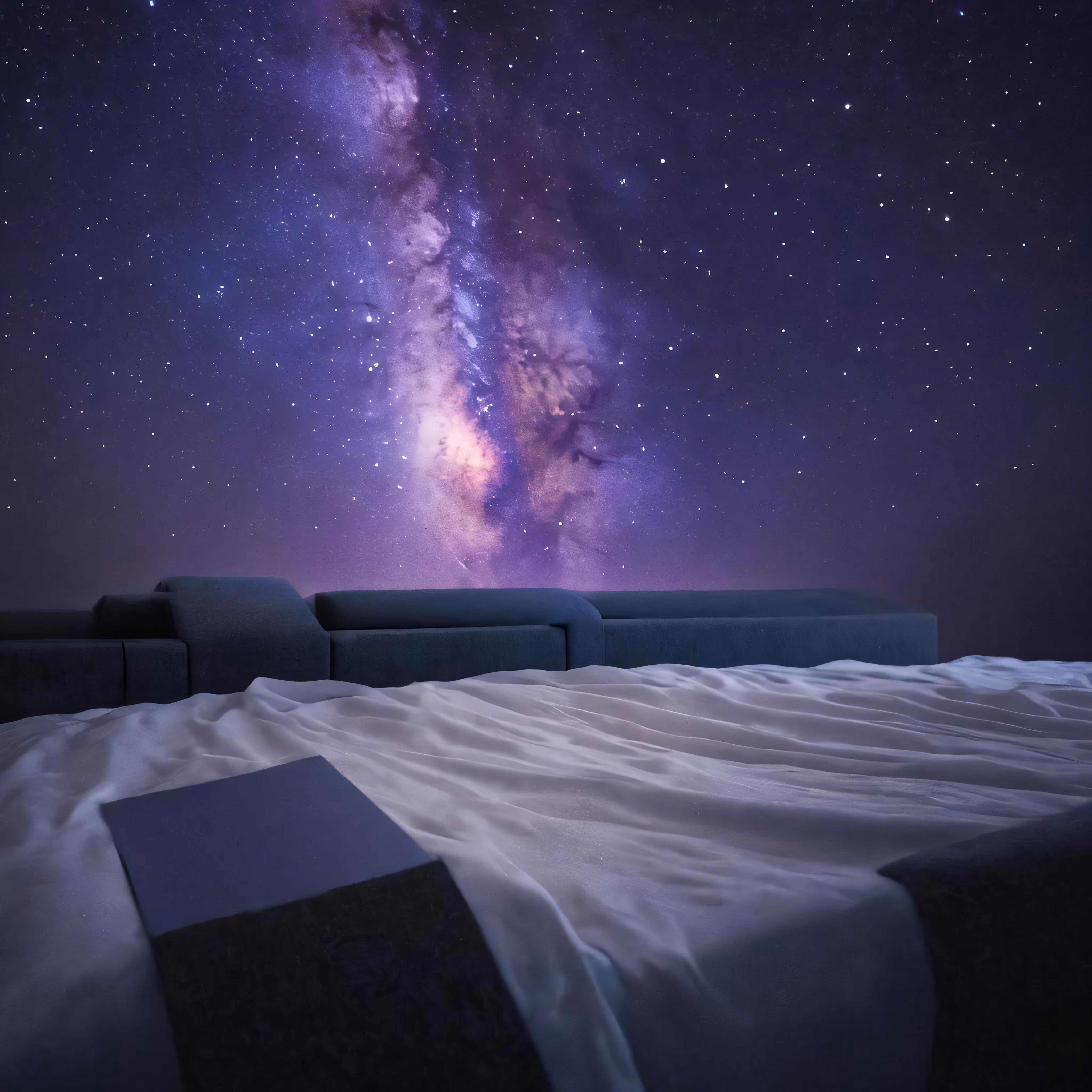 High resolution picture, free to use, a bedroom scene with the milky rising above the stars
