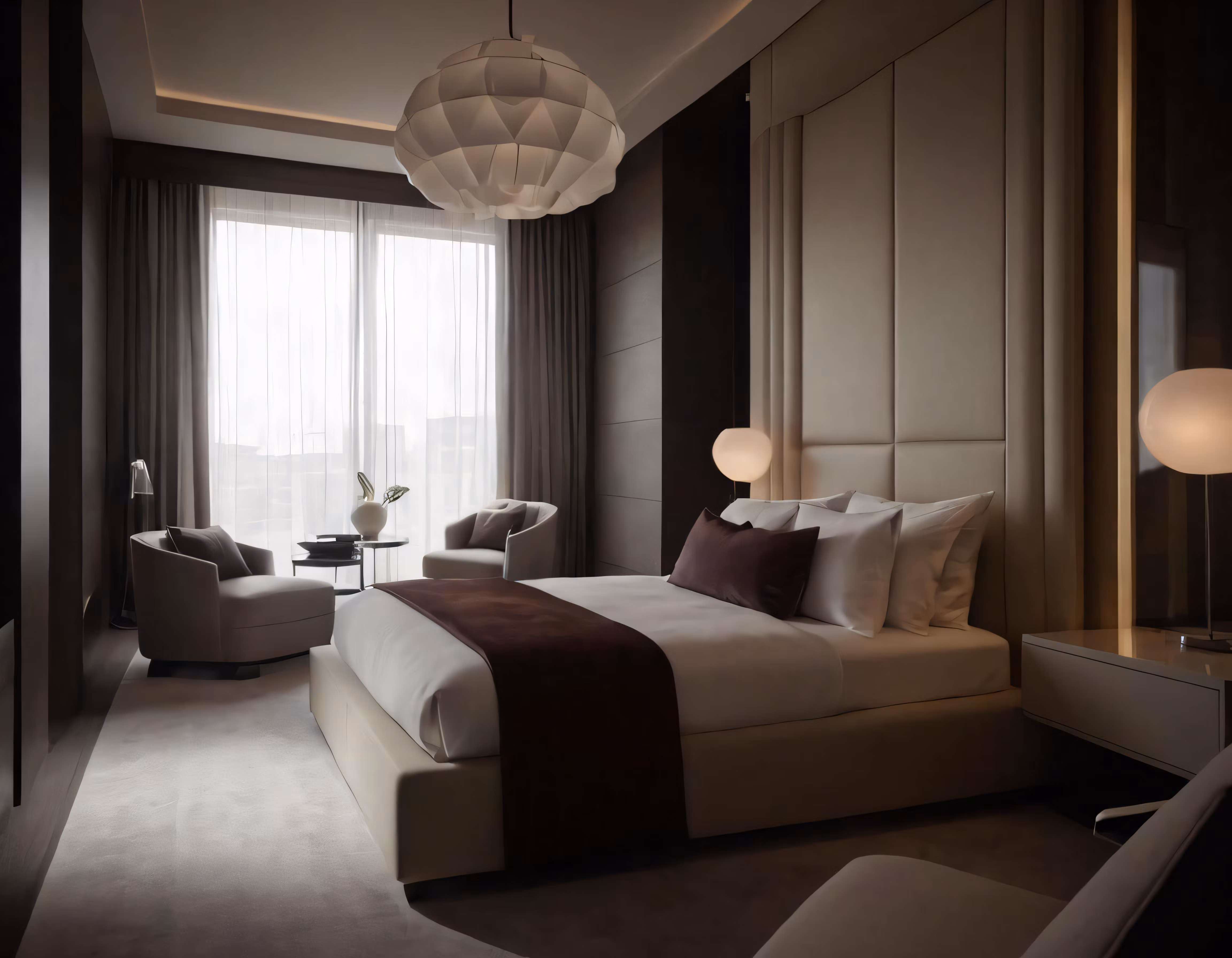 High resolution picture, free to use, a bedroom with a bed, chairs and window