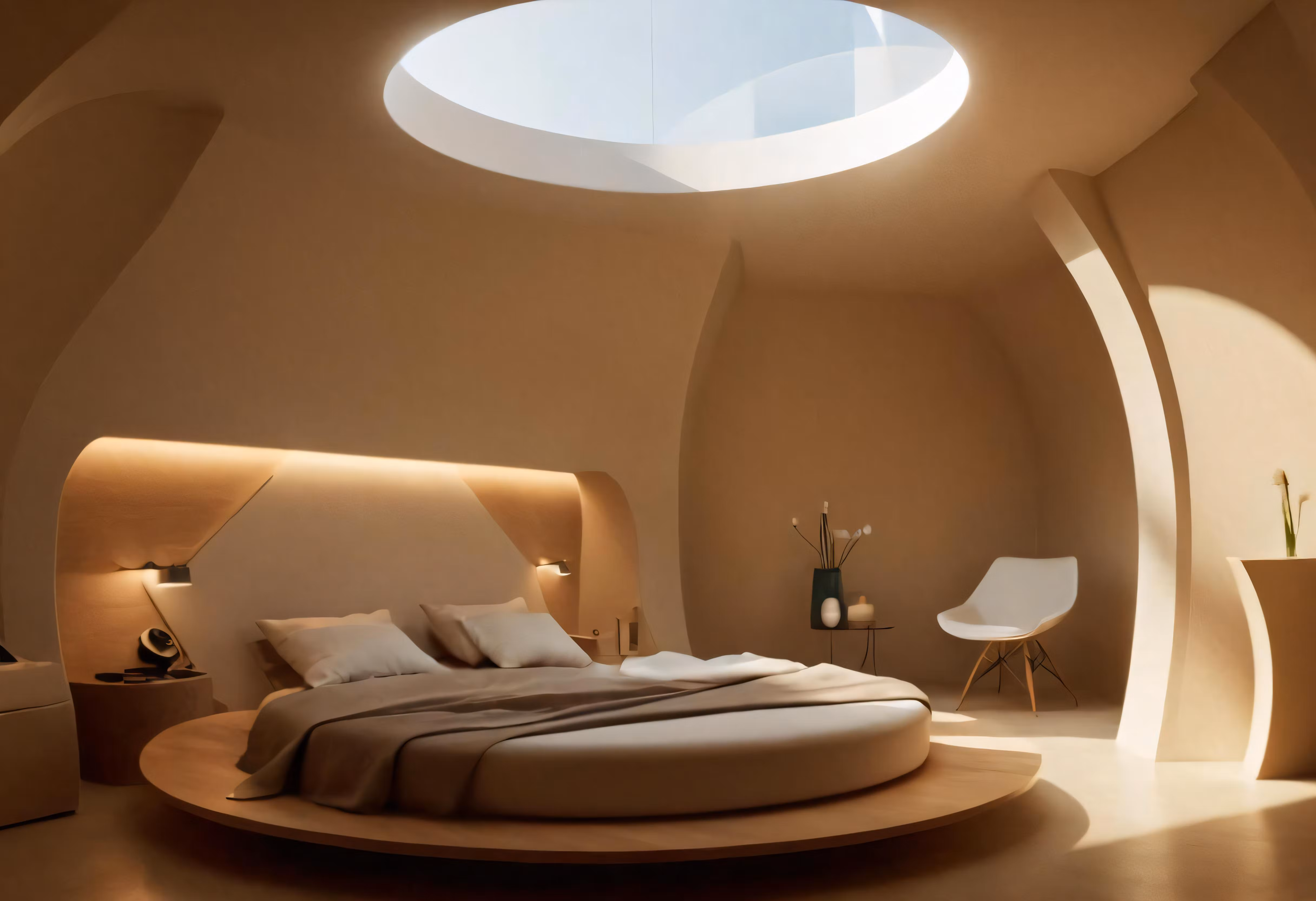 High resolution picture, free to use, a bedroom with a circular bed and a sky light