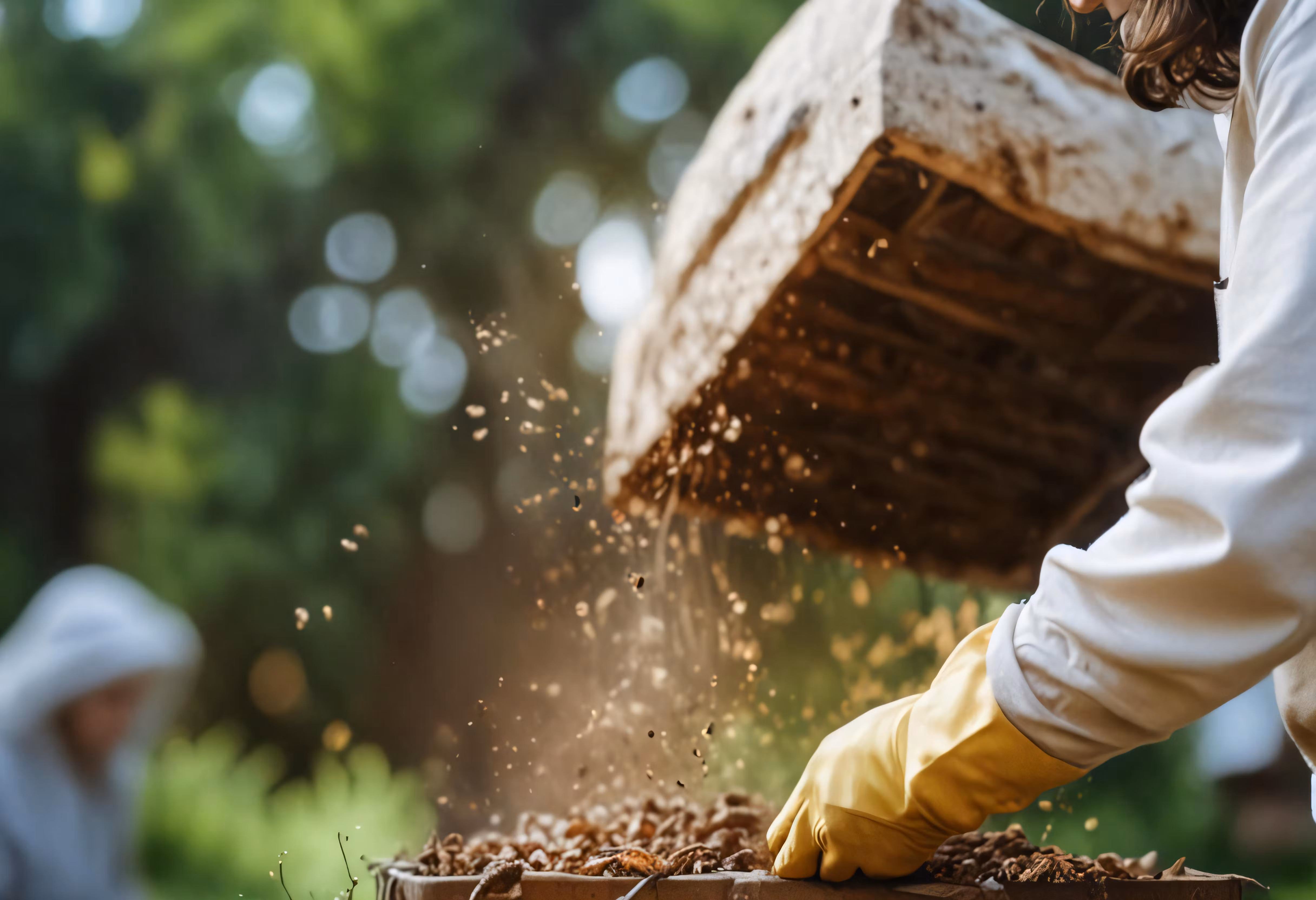 High resolution picture, free to use, a beekeeper picks up a lot of bees from the hive box