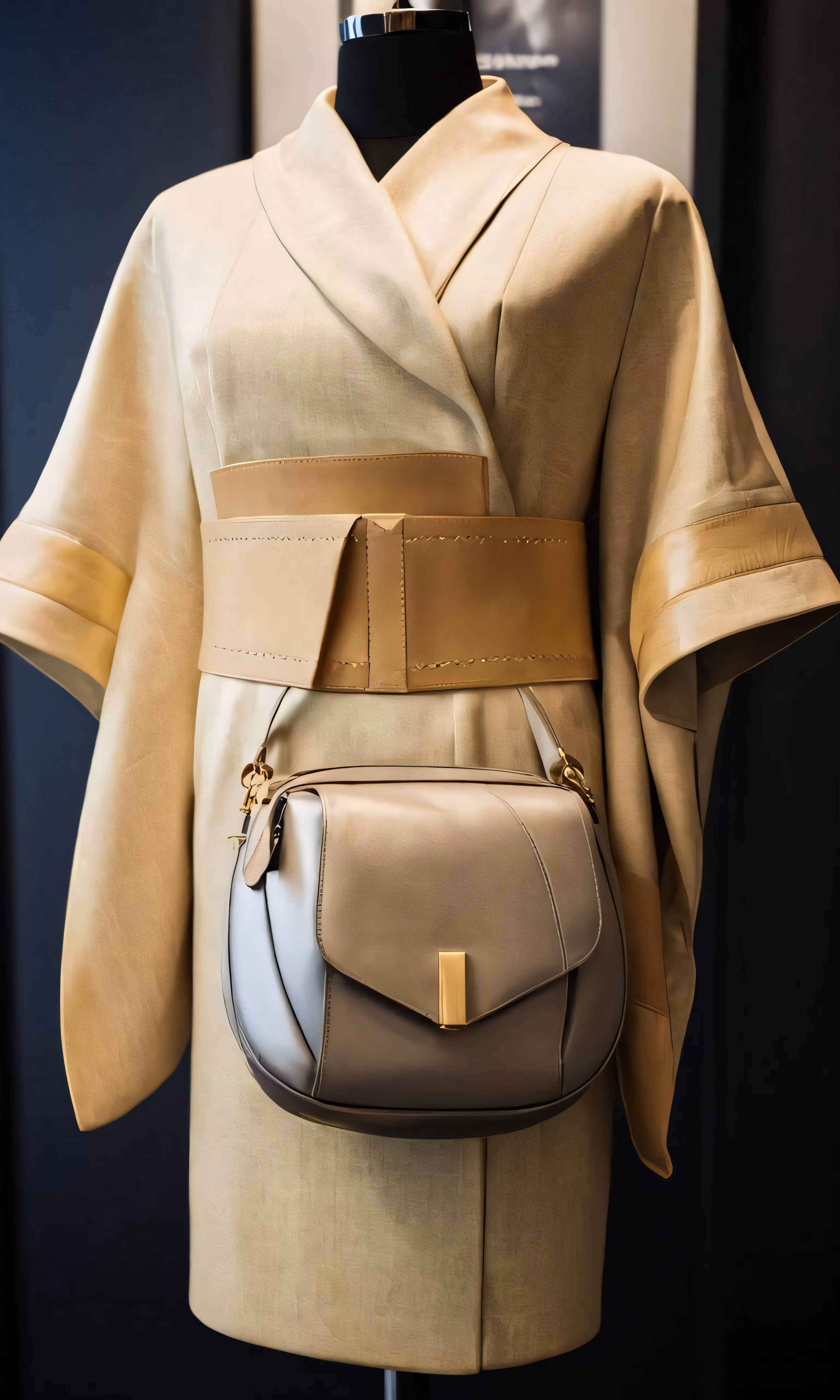 High resolution picture, free to use, a beige and grey leather belt bag hanging on a dummy head