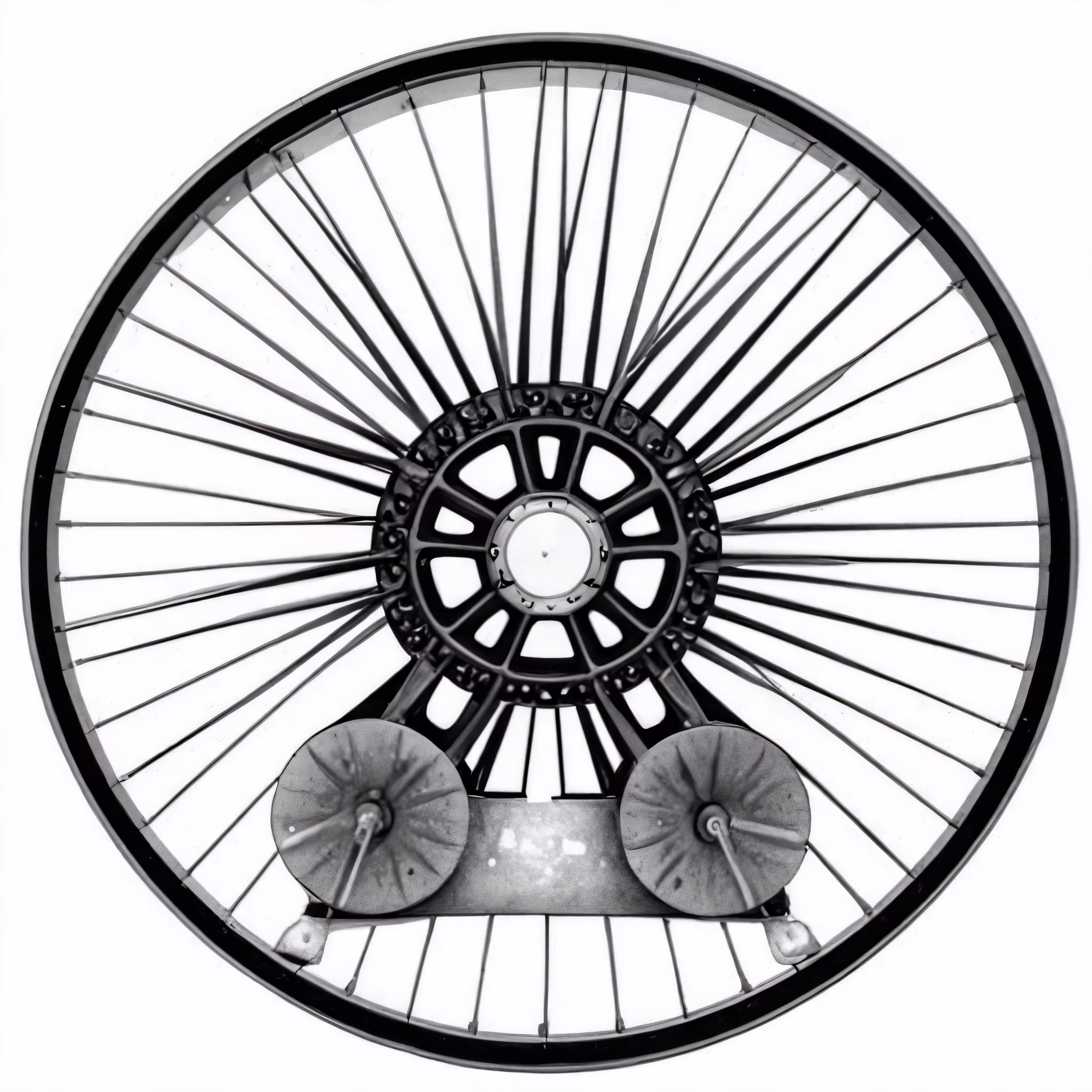 High resolution picture, free to use, a bicycle wheel with two spokes and a small round white object
