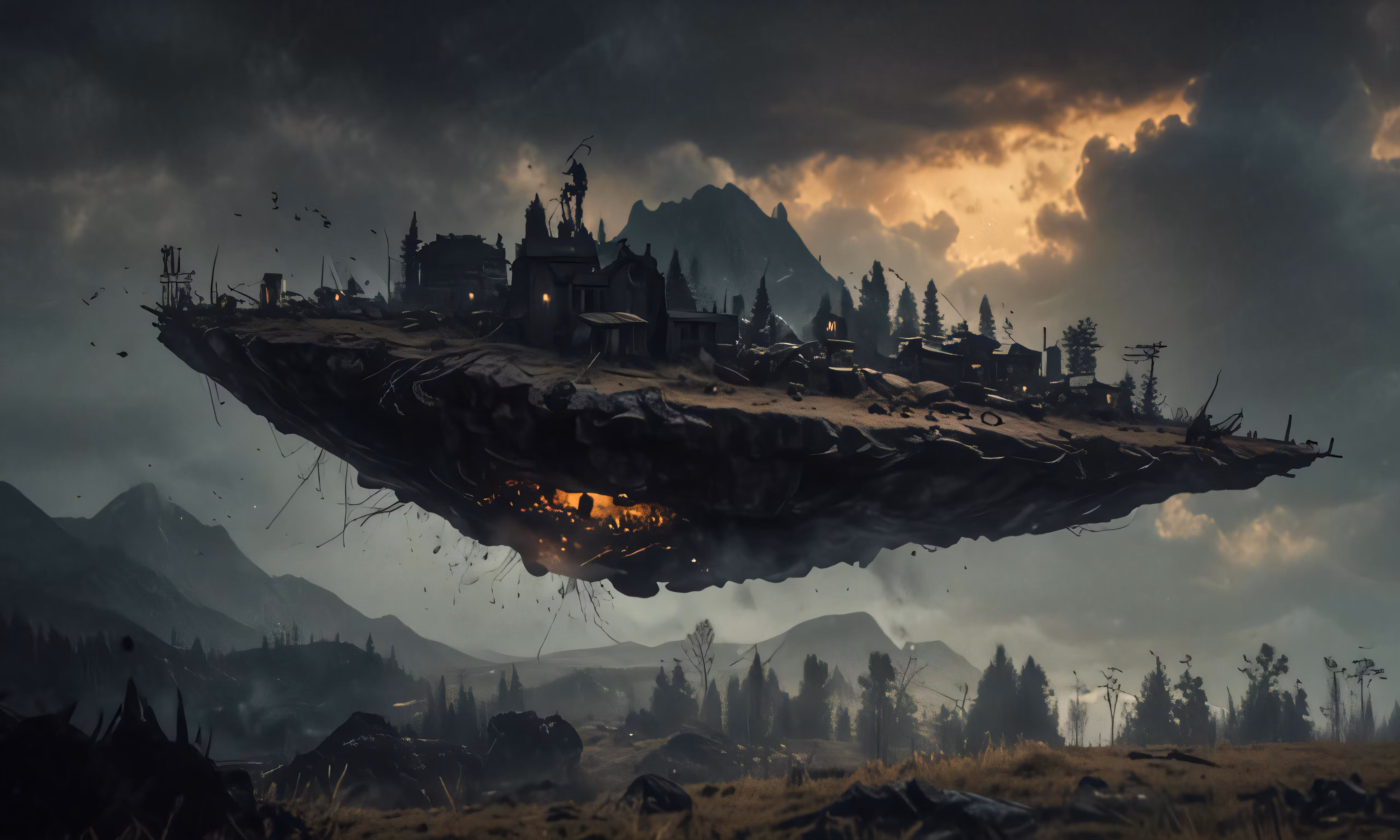 High resolution picture, free to use, a big floating ship in a sky over a forest filled field