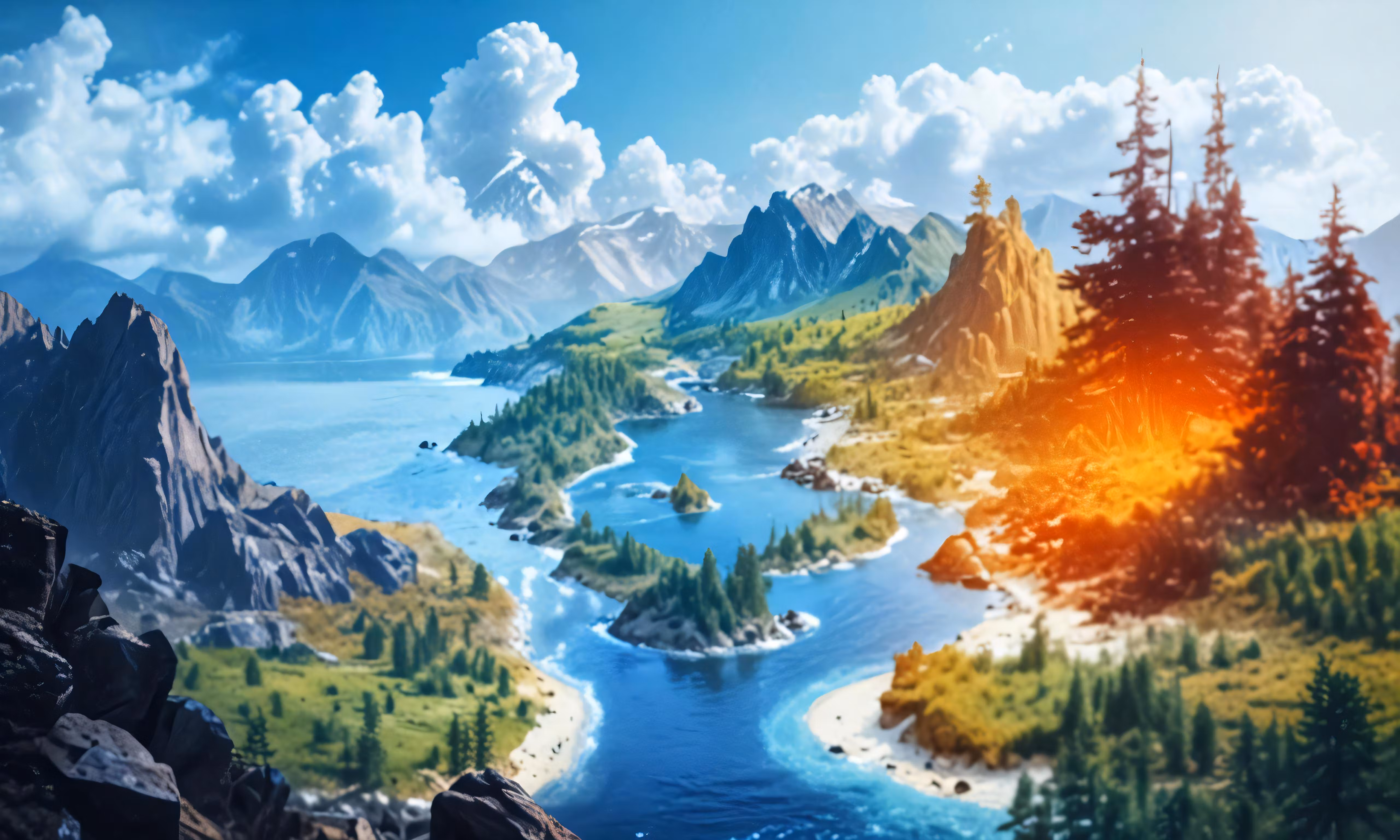 High resolution picture, free to use, a bird flying over a large forest filled countryside