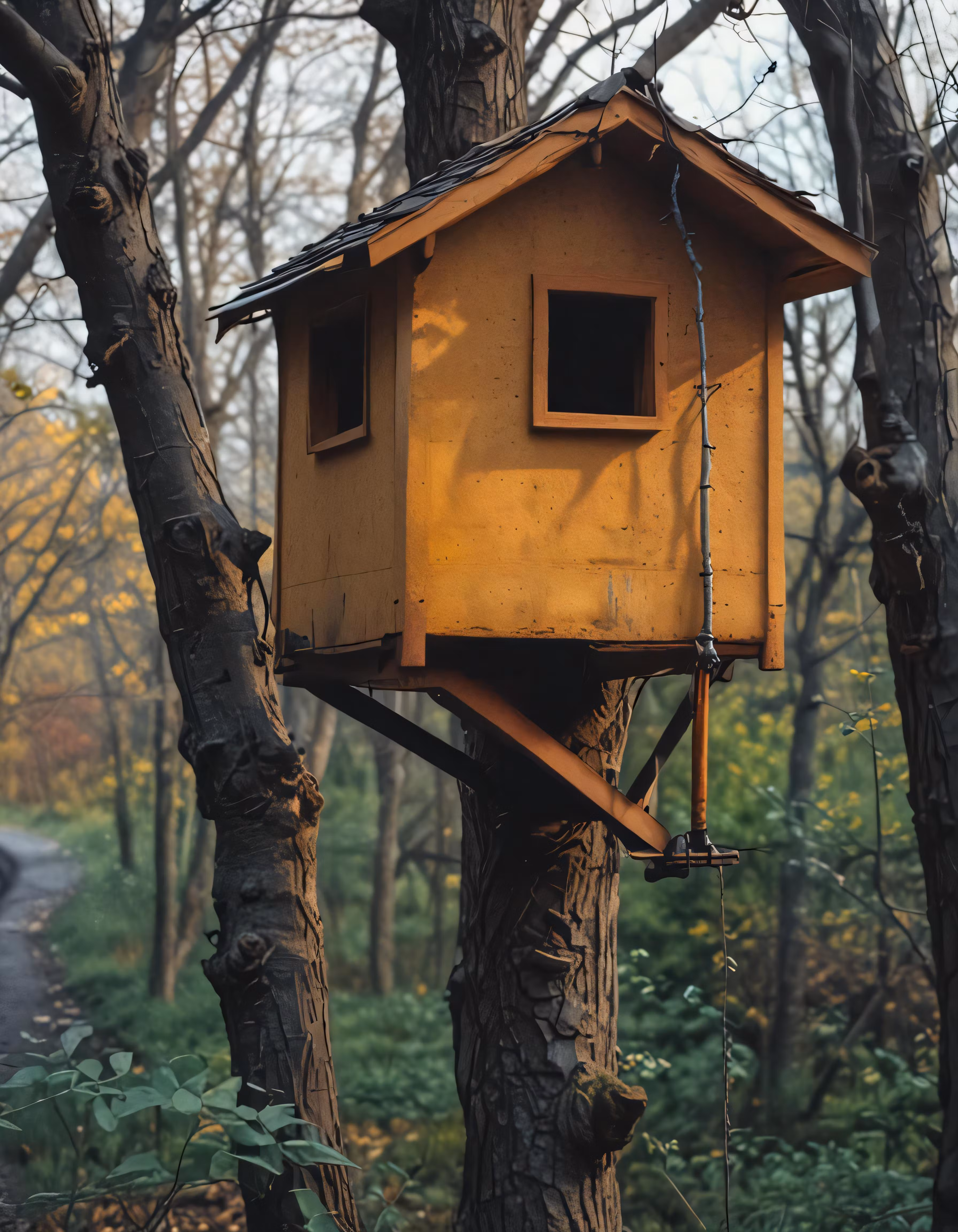 High resolution picture, free to use, a birdhouse perched on the side of a tree in the woods