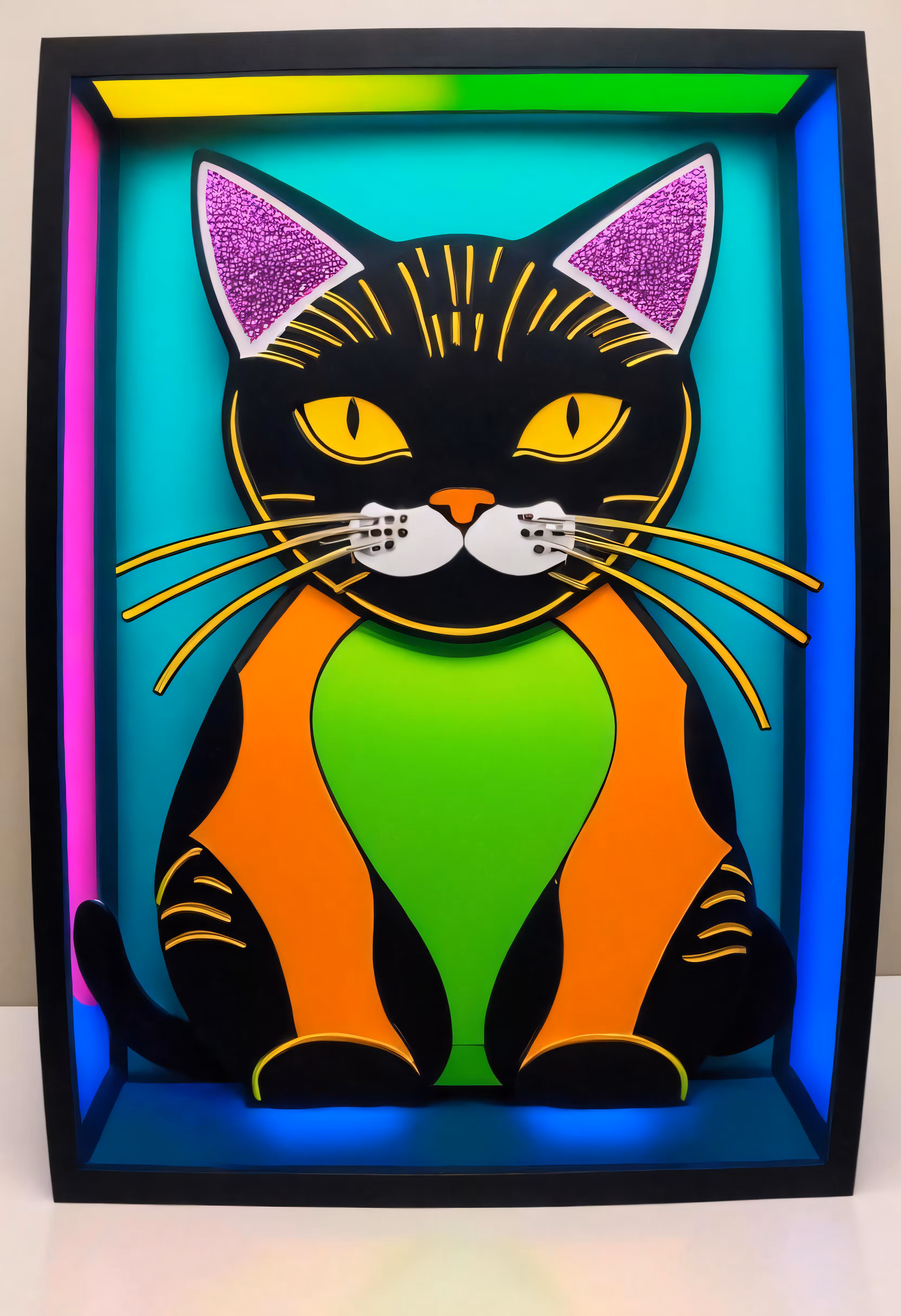 High resolution picture, free to use, a black and orange cat is in a colorful glass frame