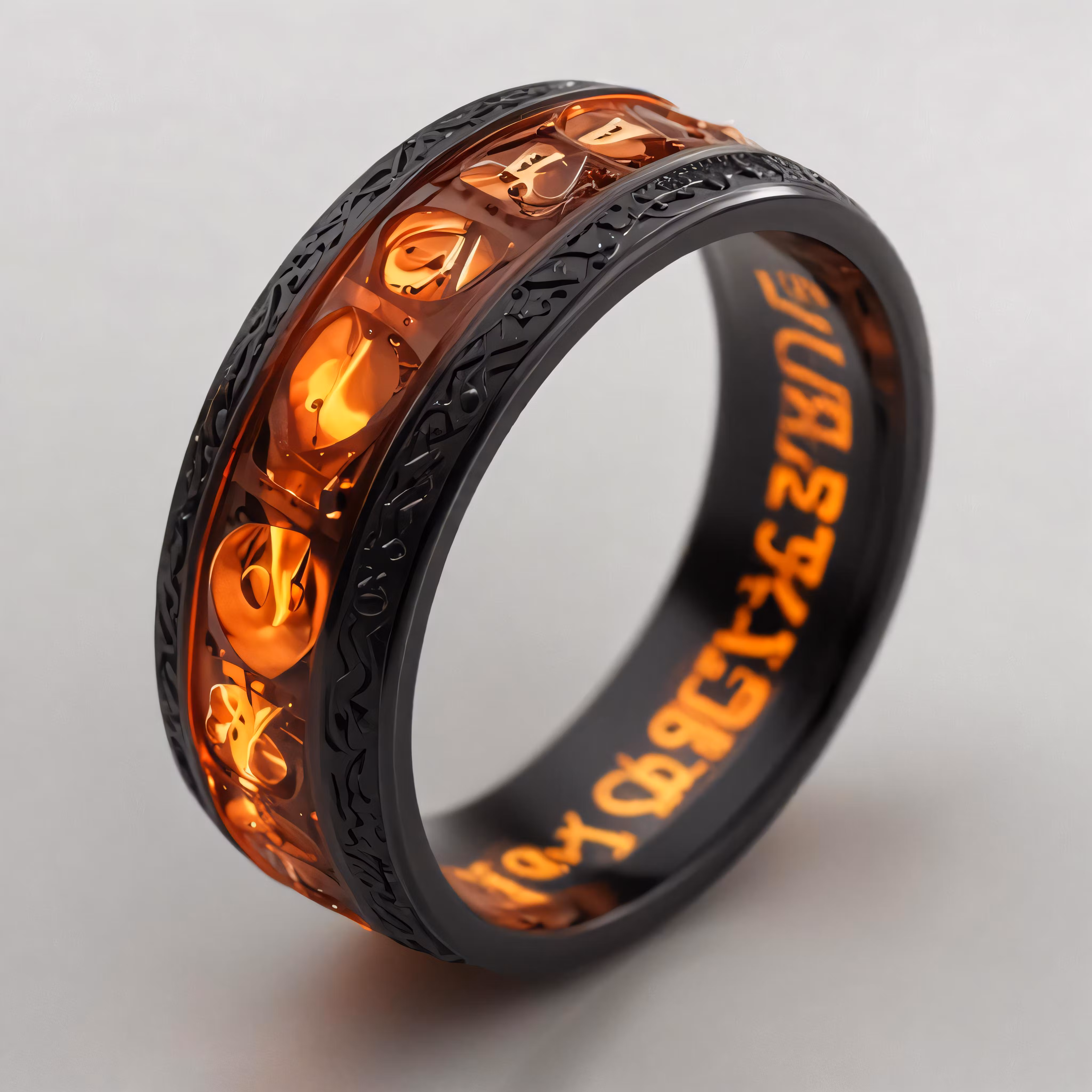 High resolution picture, free to use, a black and orange ring with glowing yellow skulls on it
