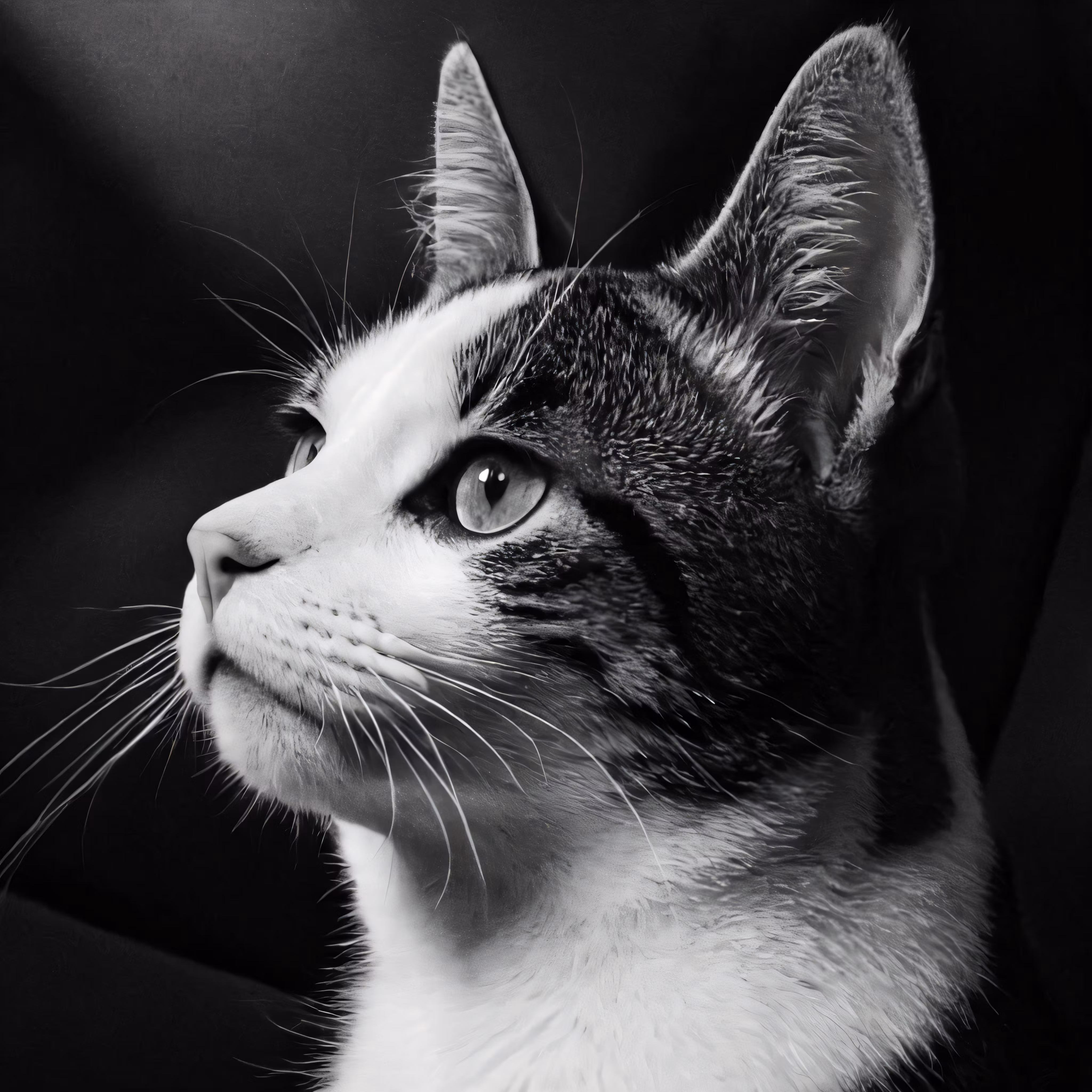 High resolution picture, free to use, a black and white cat looking upward