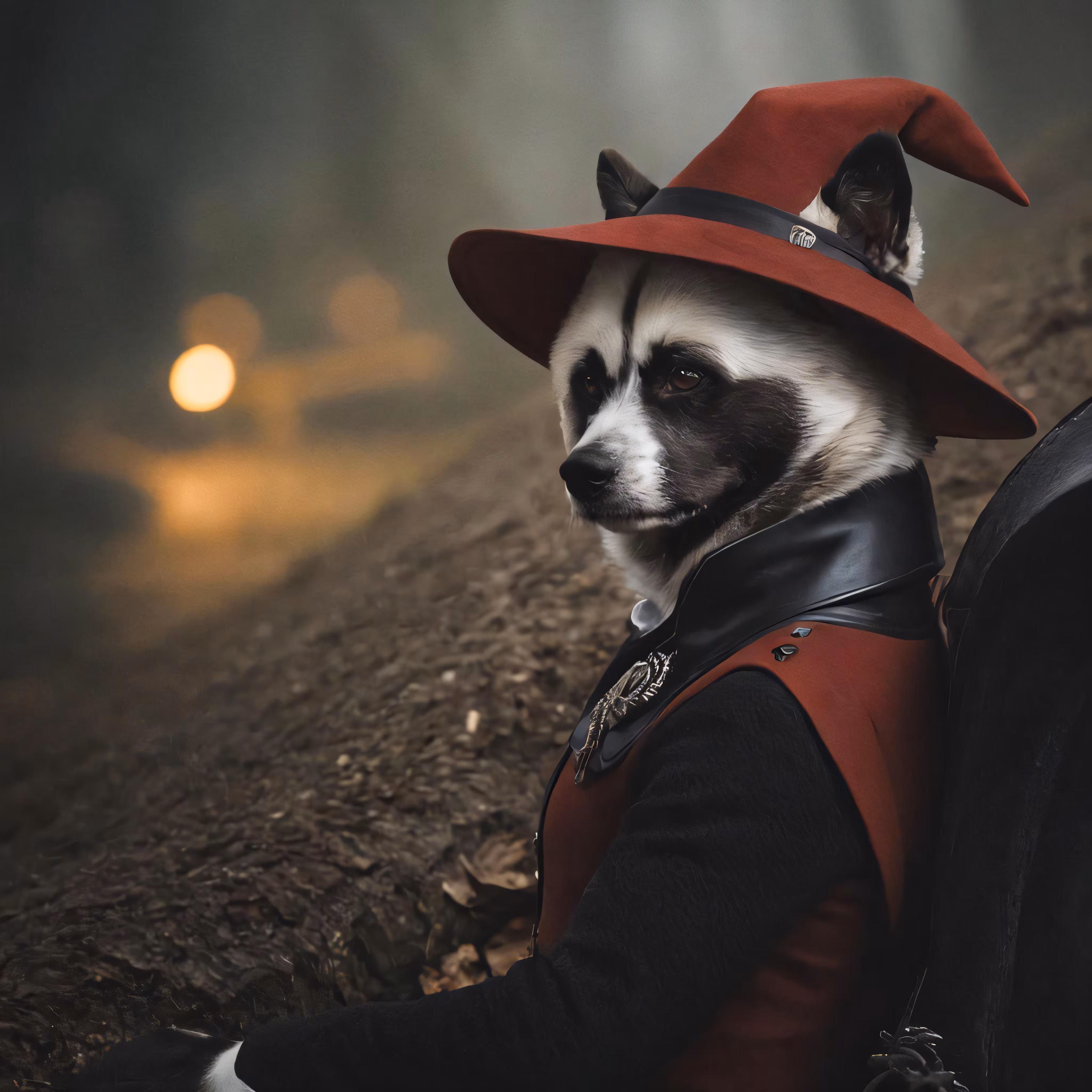 High resolution picture, free to use, a black and white dog wearing a red hat on the back of a bag