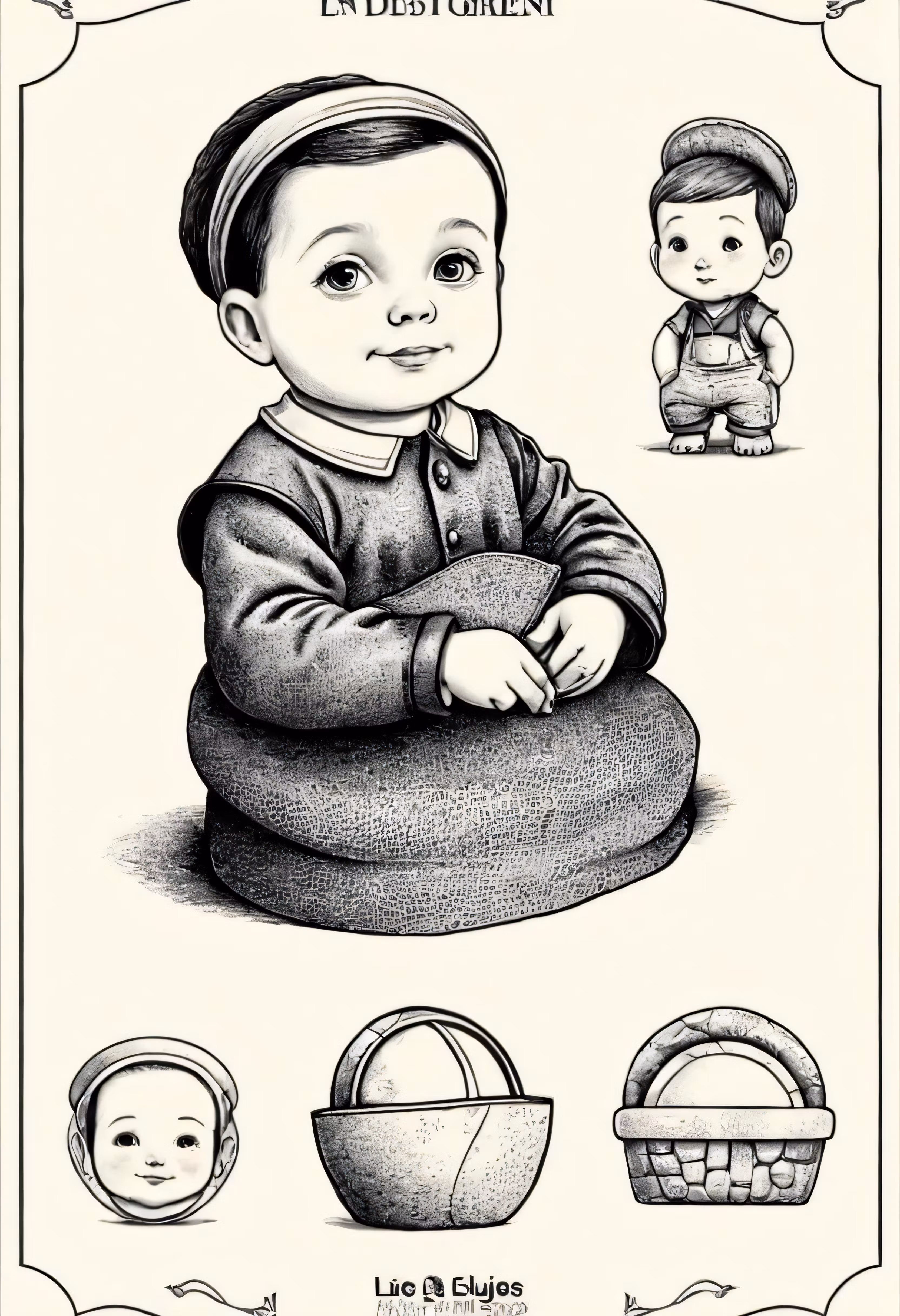 High resolution picture, free to use, a black and white drawing of a baby with toys