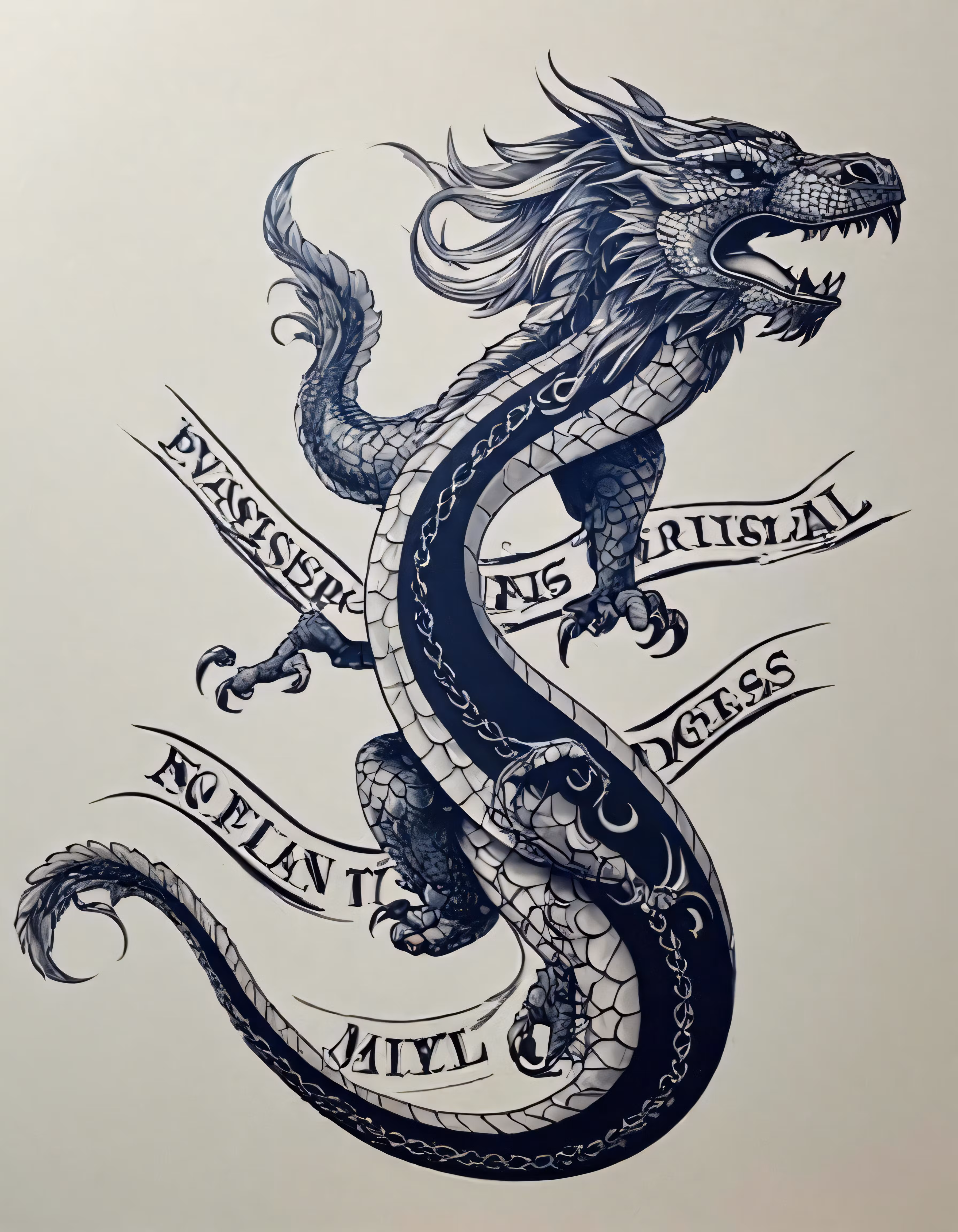 High resolution picture, free to use, a black and white drawing of a dragon with lettering