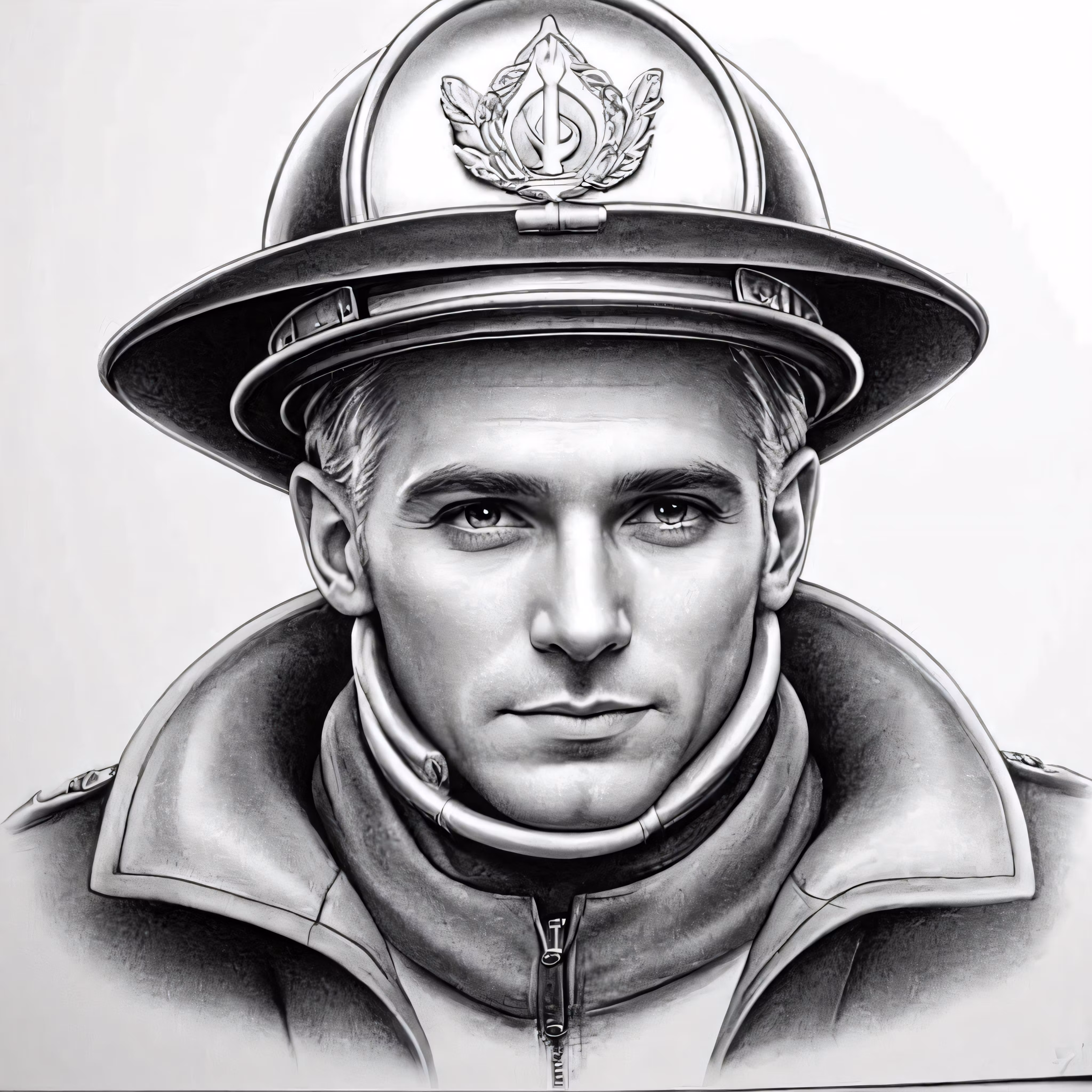 High resolution picture, free to use, a black and white drawing of a fireman in a helmet