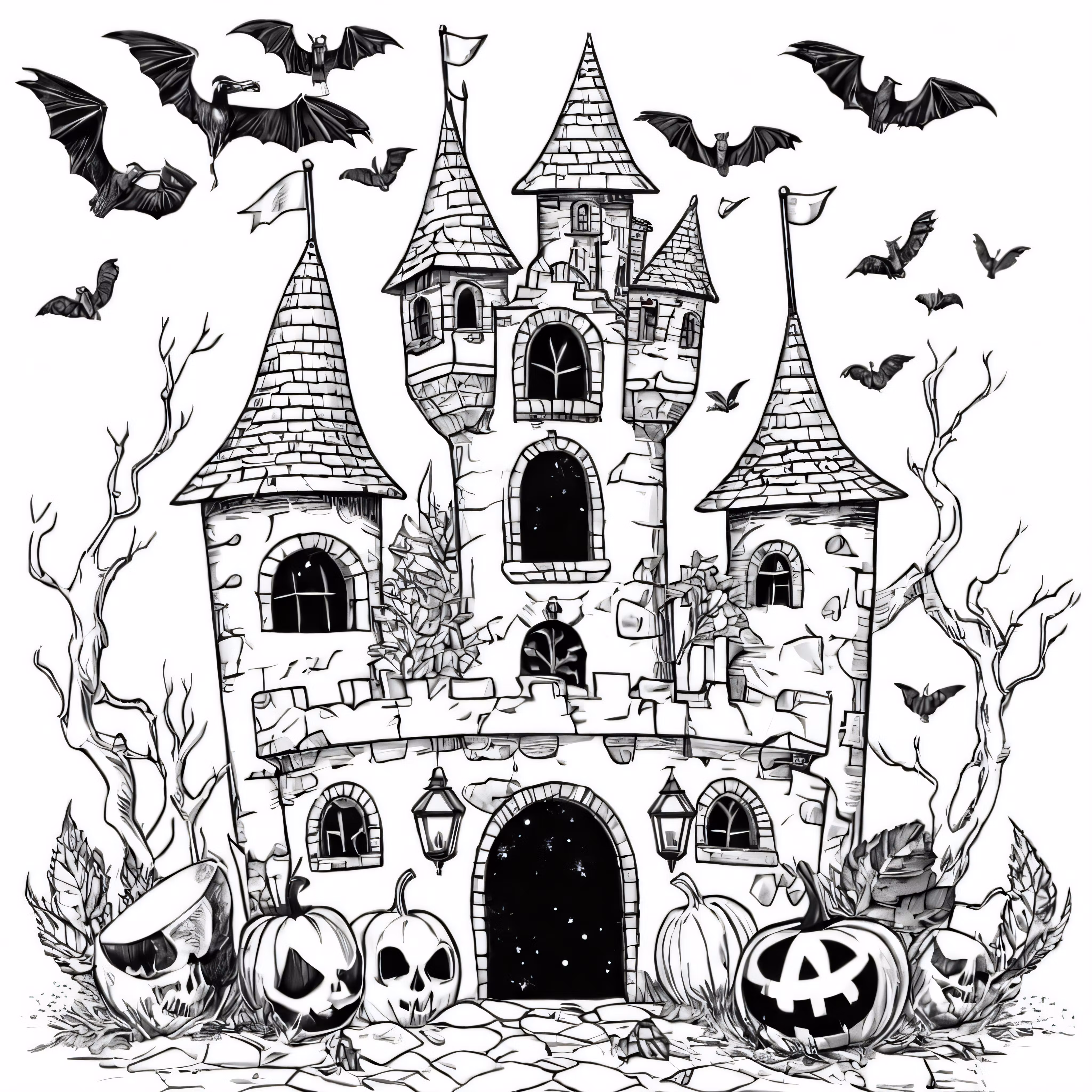 High resolution picture, free to use, a black and white drawing of a halloween castle with jack o lanterns