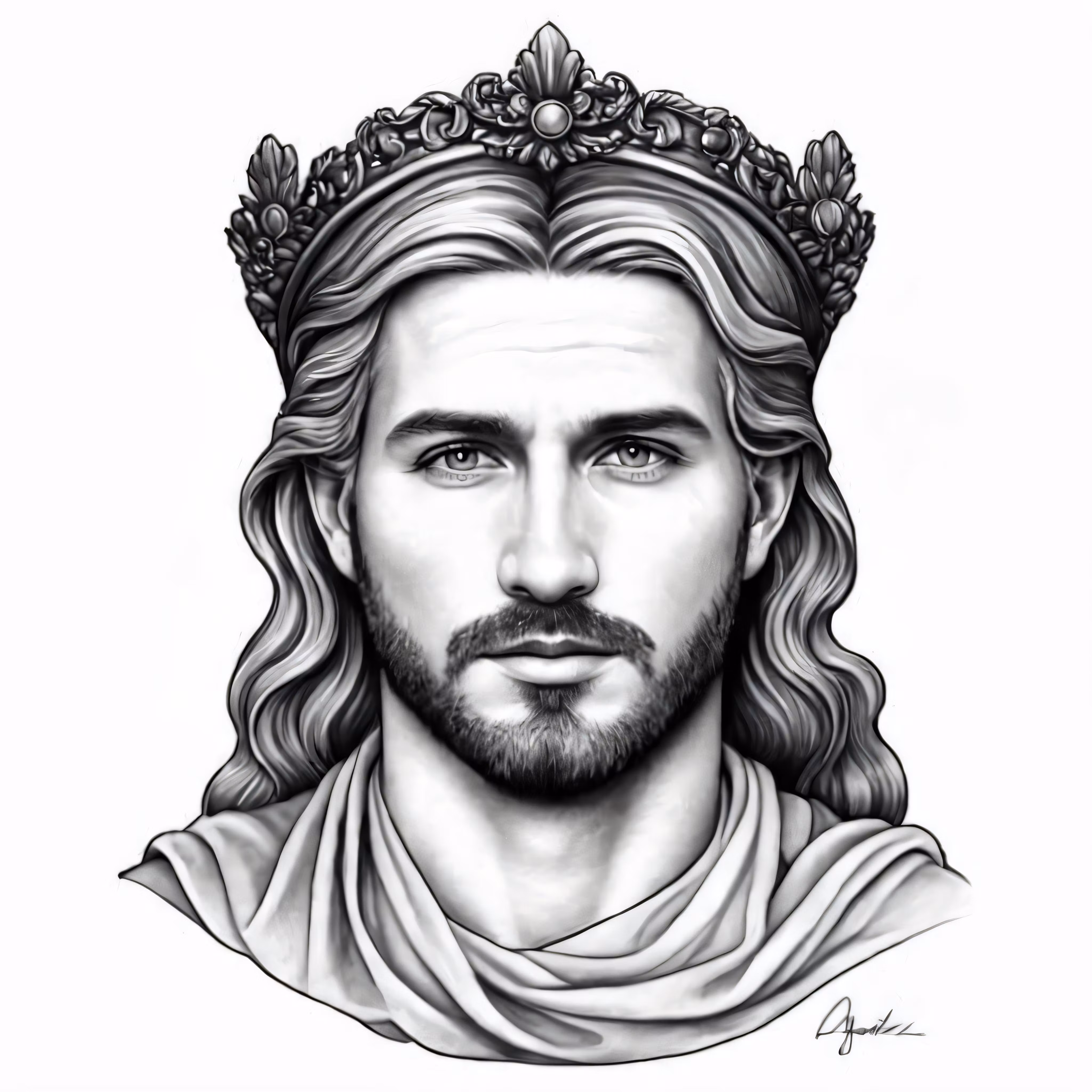 High resolution picture, free to use, a black and white drawing of a man with long hair wearing a crown