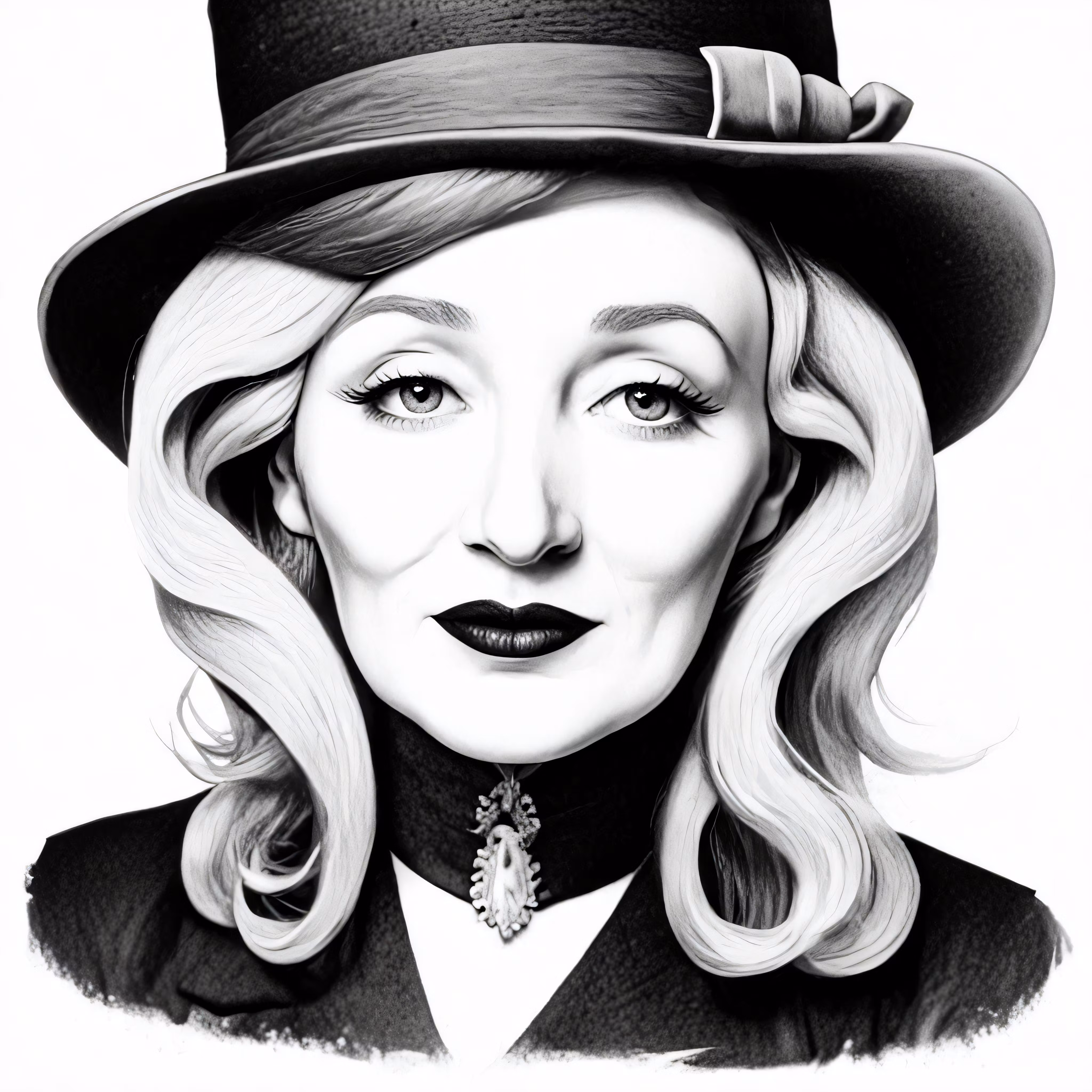 High resolution picture, free to use, a black and white drawing of a woman wearing a hat