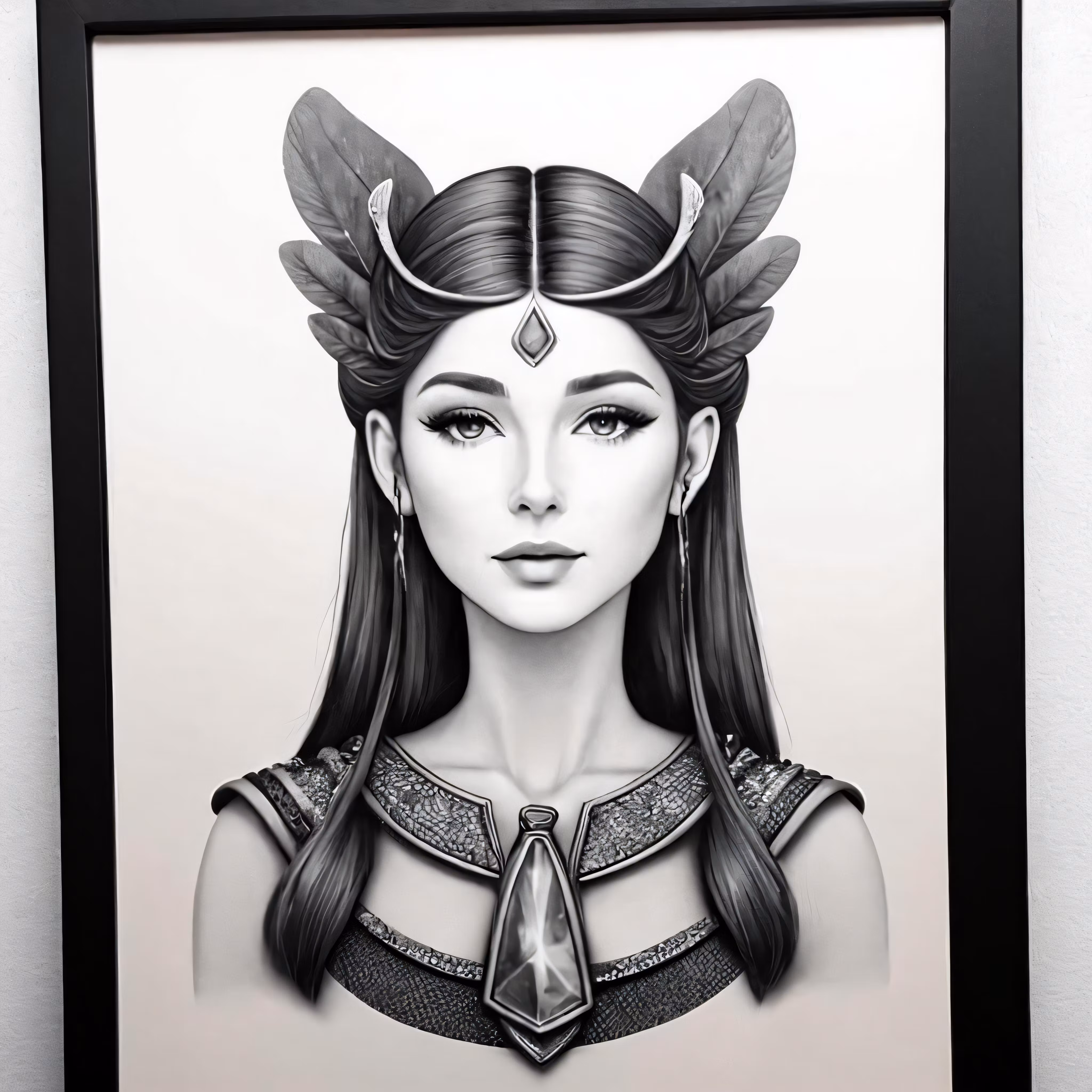 High resolution picture, free to use, a black and white drawing of a woman with an ear ring on her head