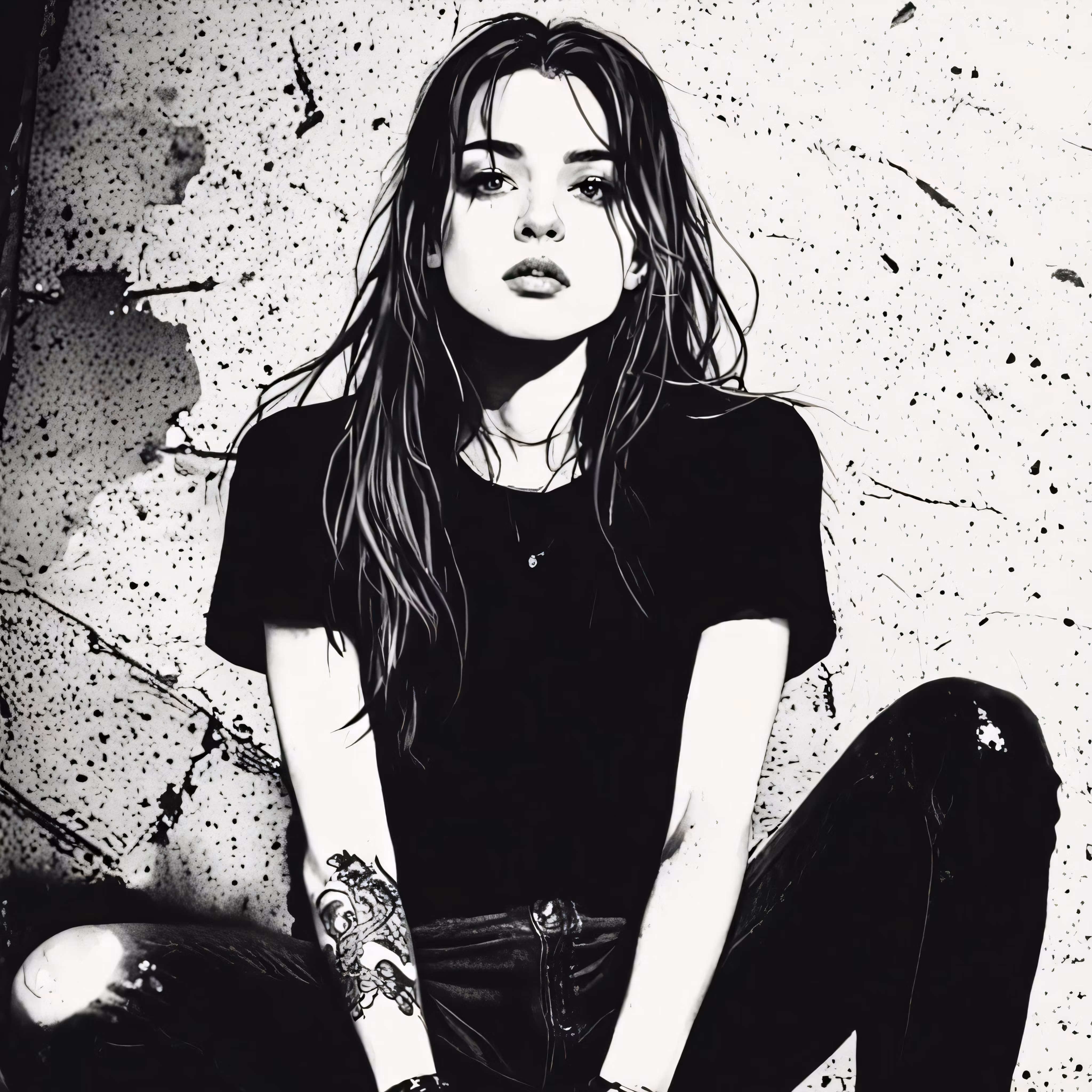 High resolution picture, free to use, a black and white drawing of a woman with tattoos
