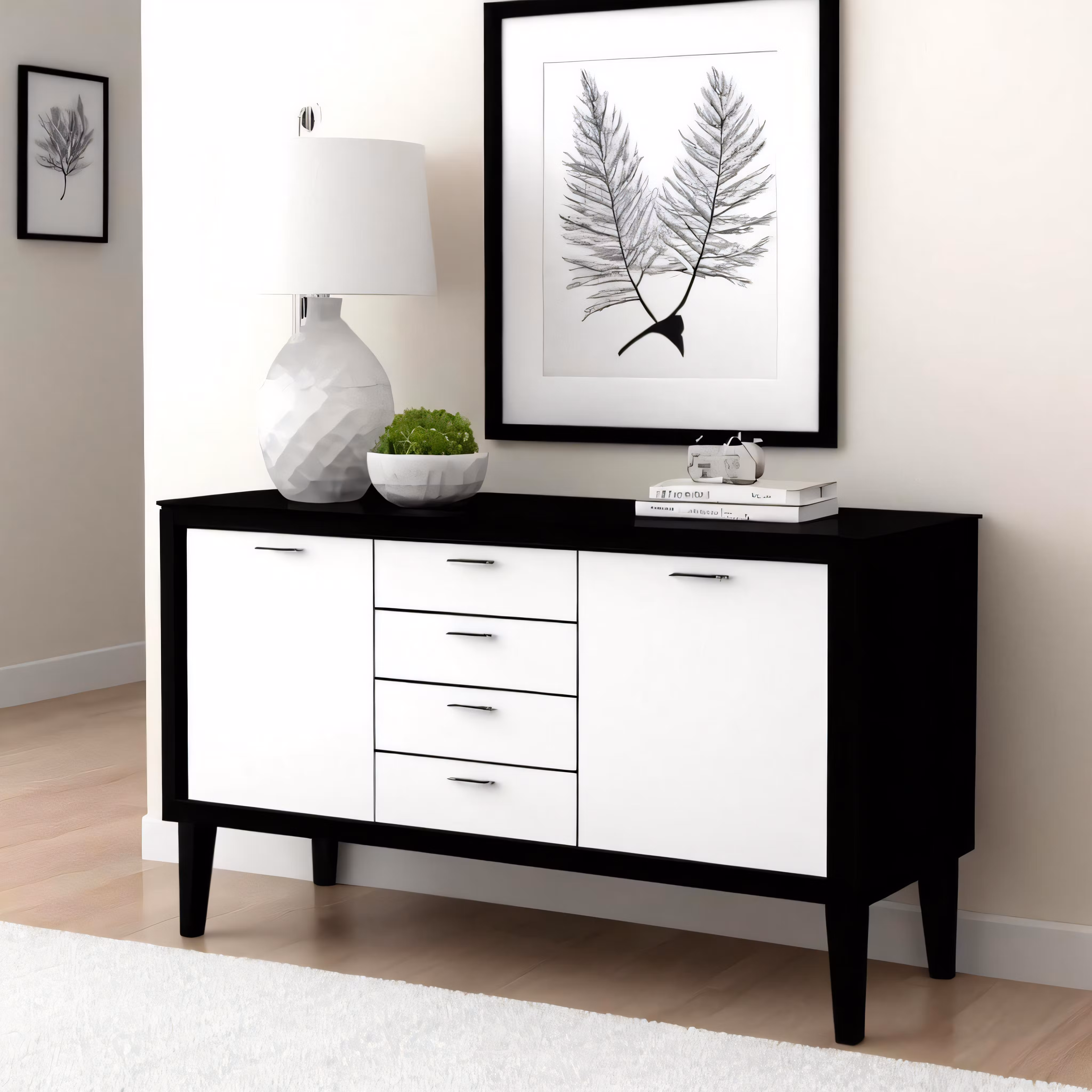 High resolution picture, free to use, a black and white framed fern poster above a black and white cabinet