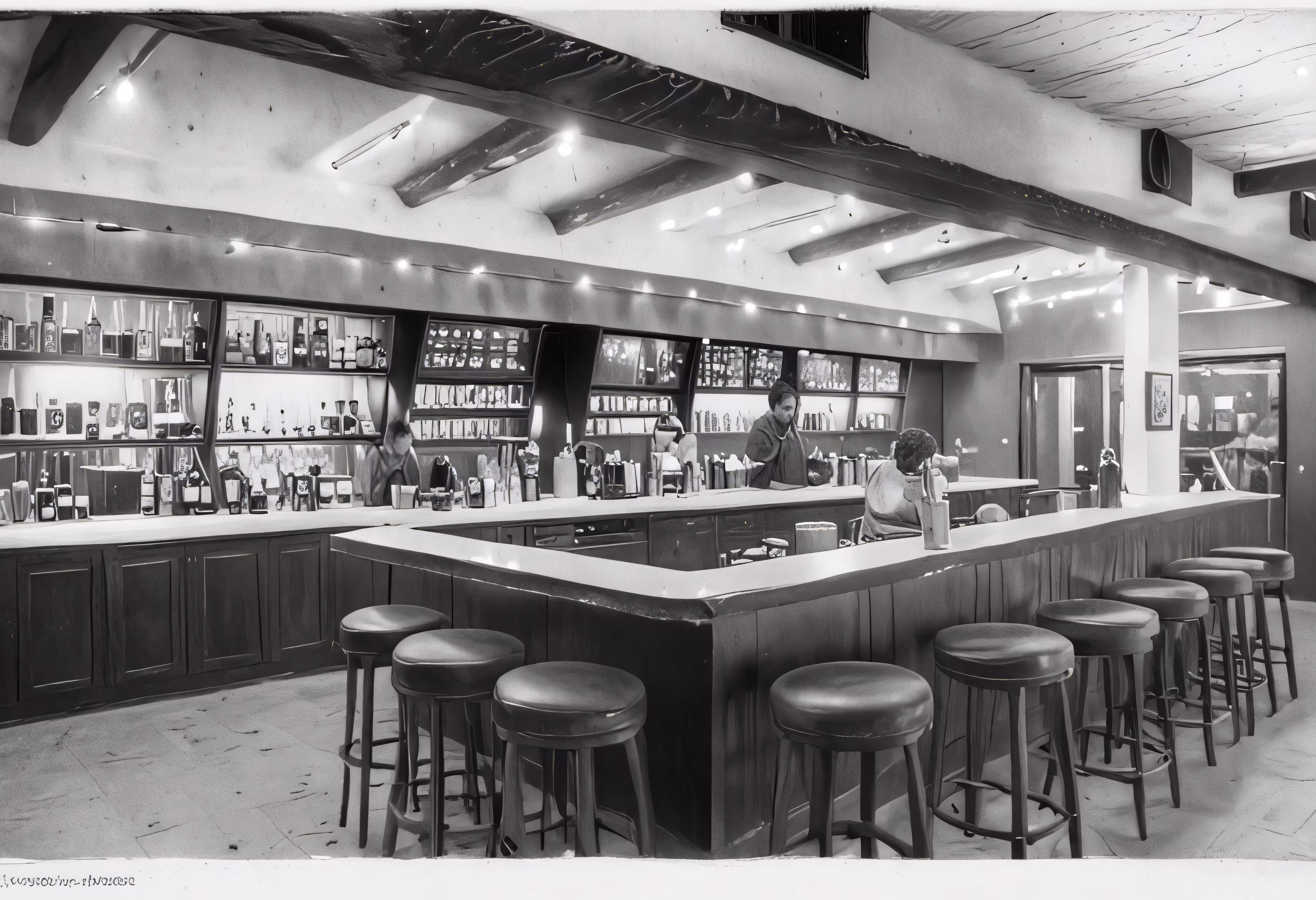 High resolution picture, free to use, a black and white image of a bartender and rows of stools
