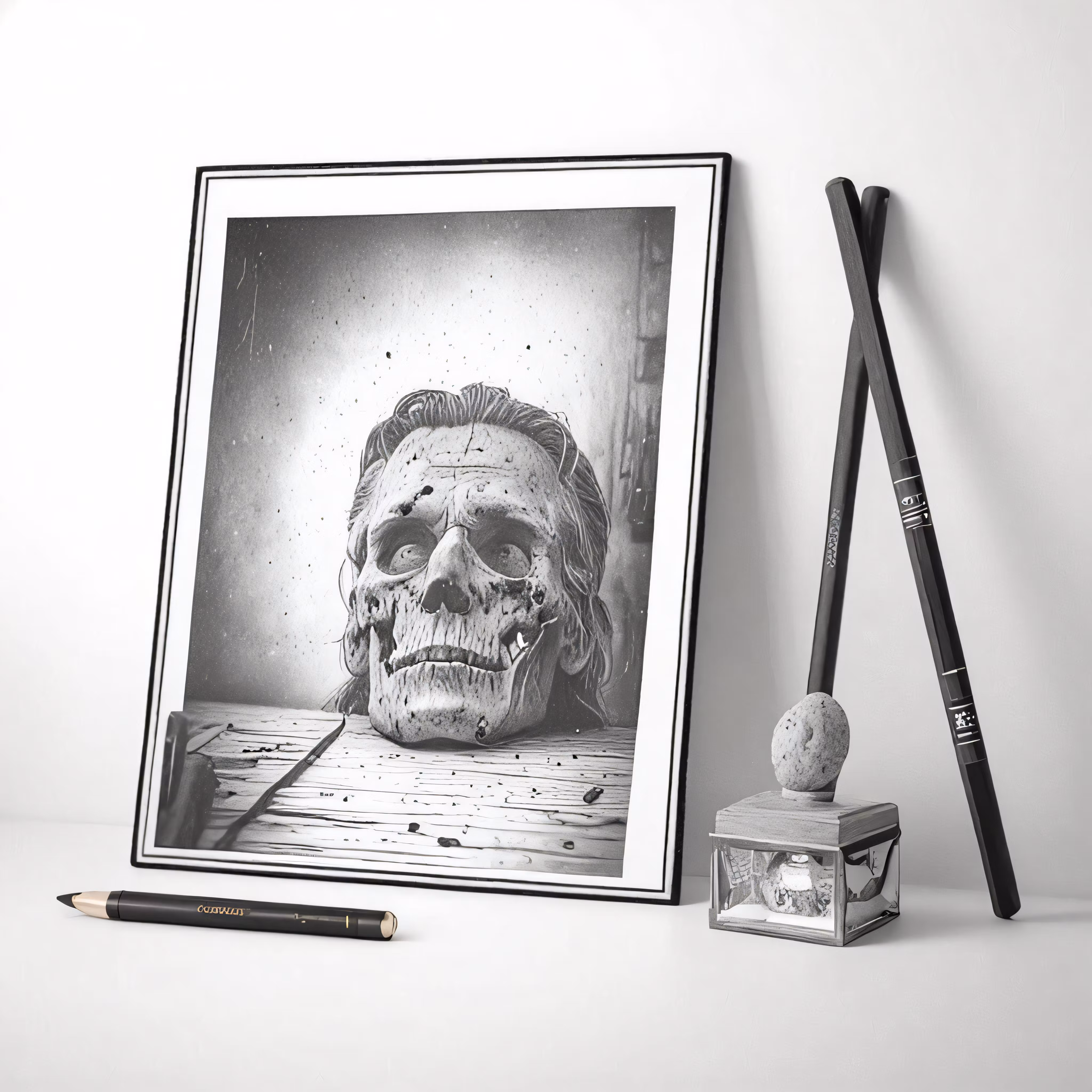 High resolution picture, free to use, a black and white painting next to a pen and an inked image