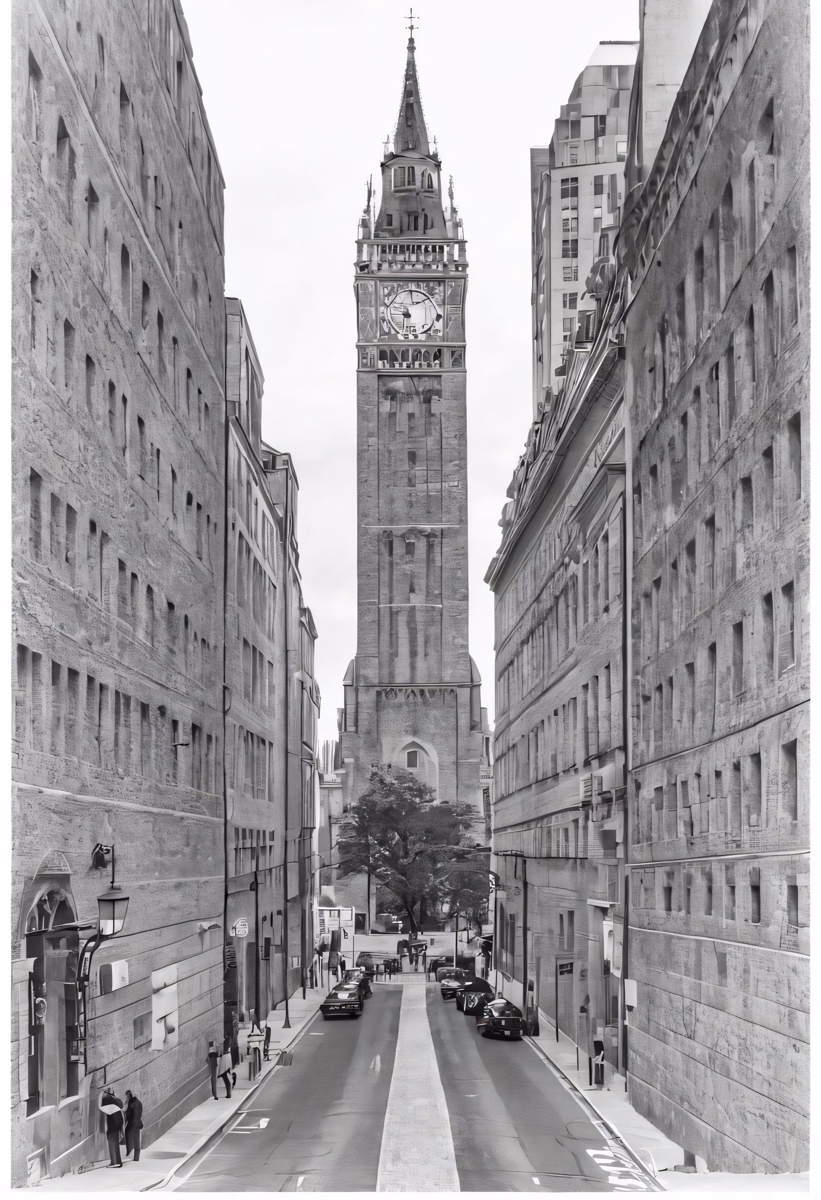 High resolution picture, free to use, a black and white photo of a clock tower in a city