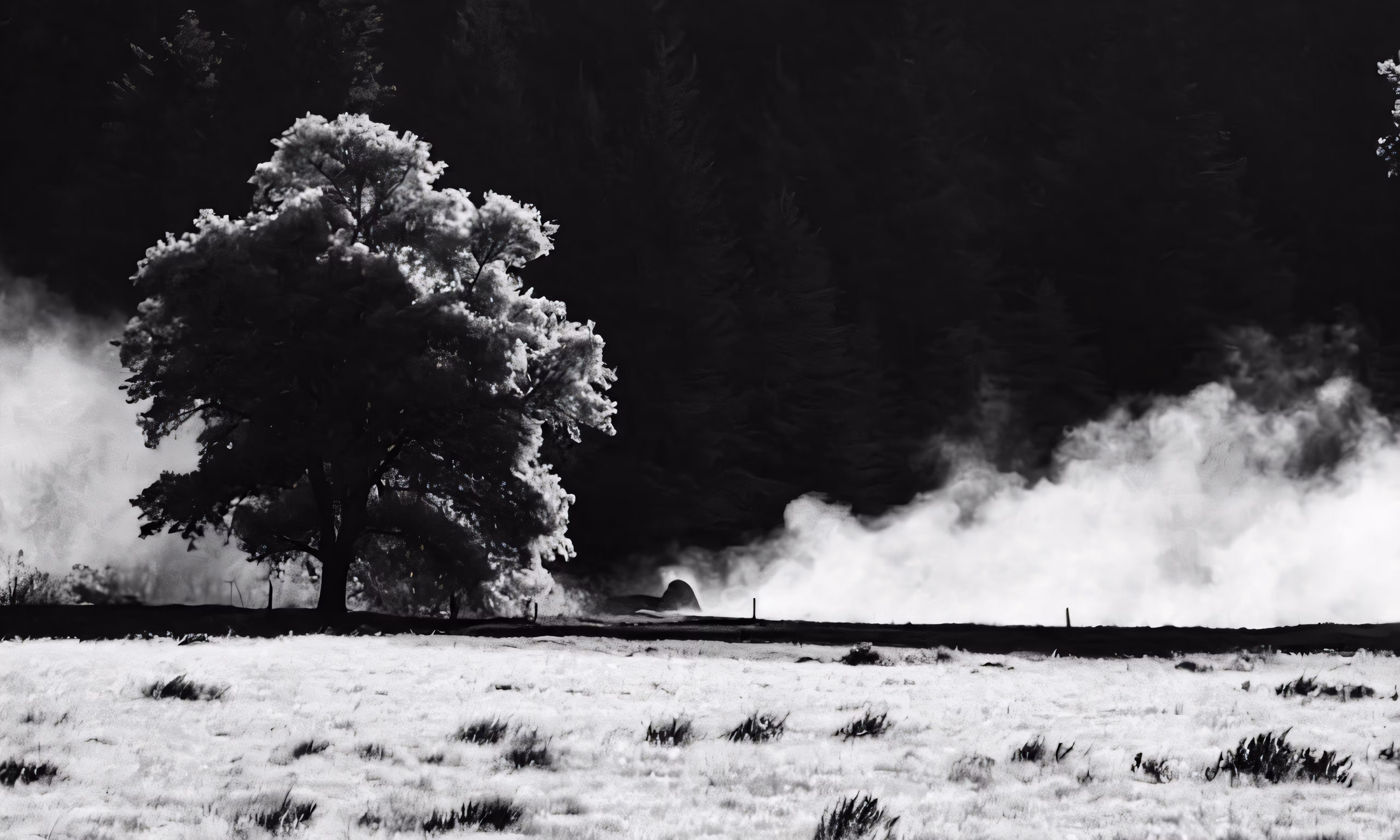 High resolution picture, free to use, a black and white photo of a tree near many smoke