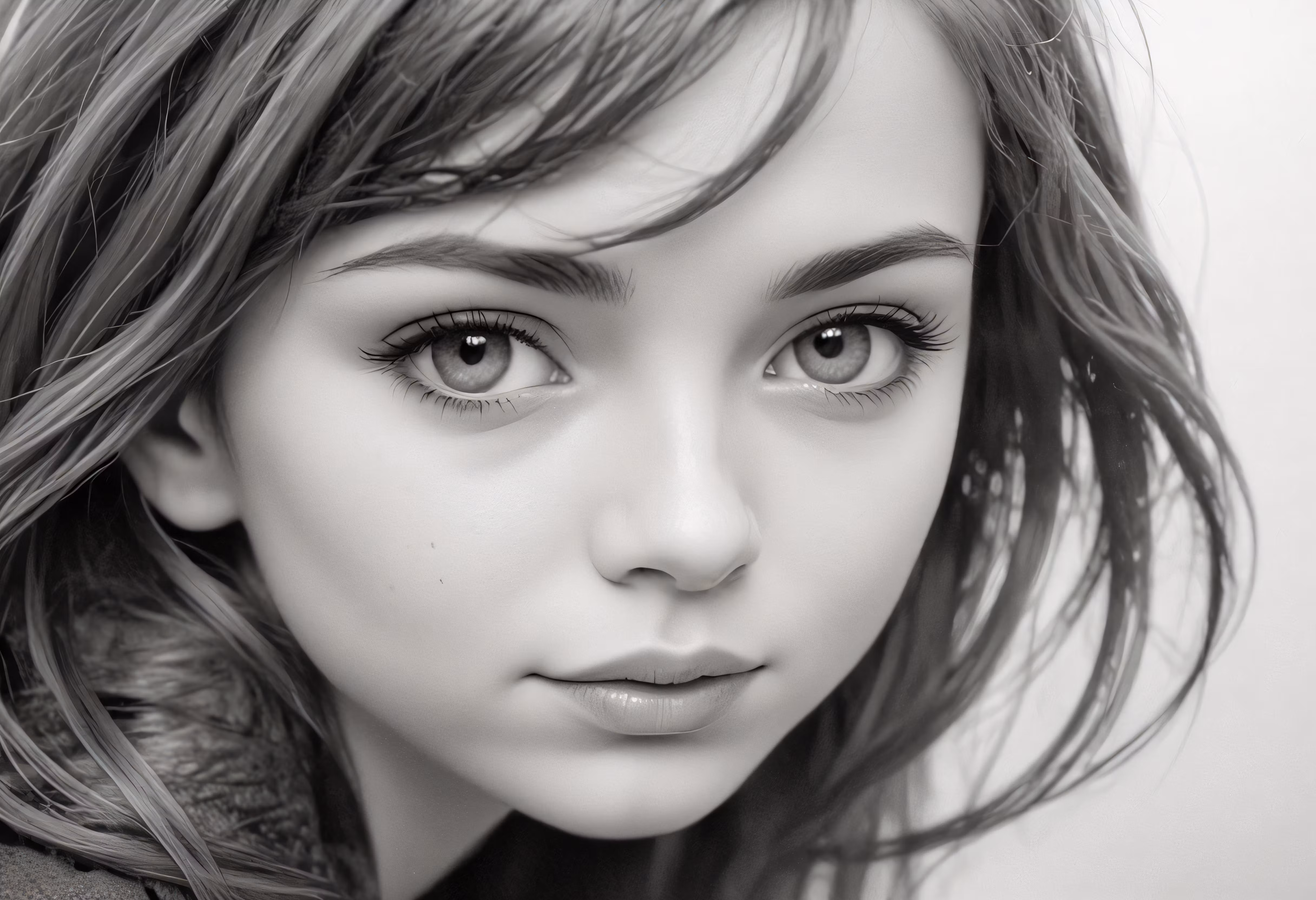 High resolution picture, free to use, a black and white photo of a woman with bangs