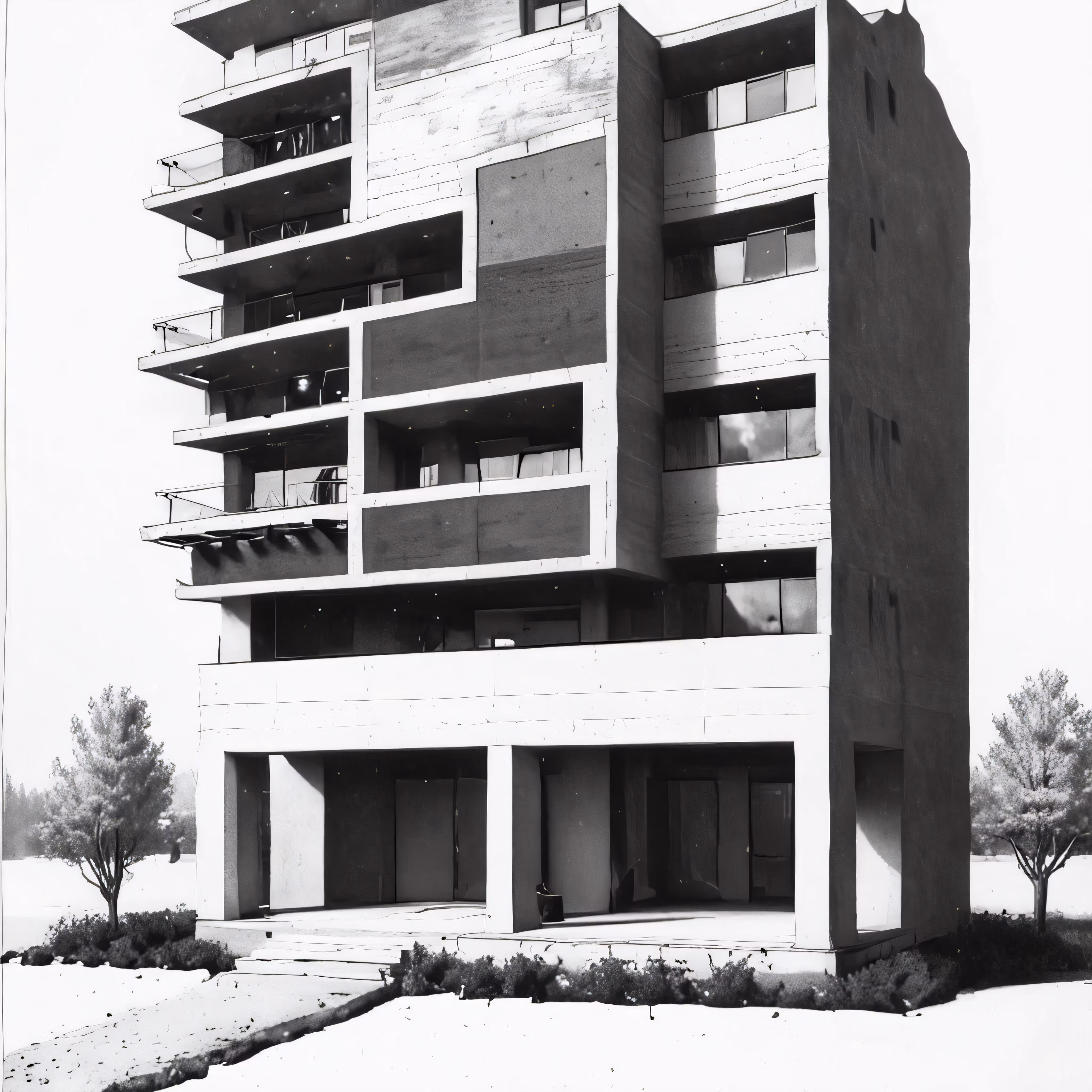 High resolution picture, free to use, a black and white photo of an apartment building