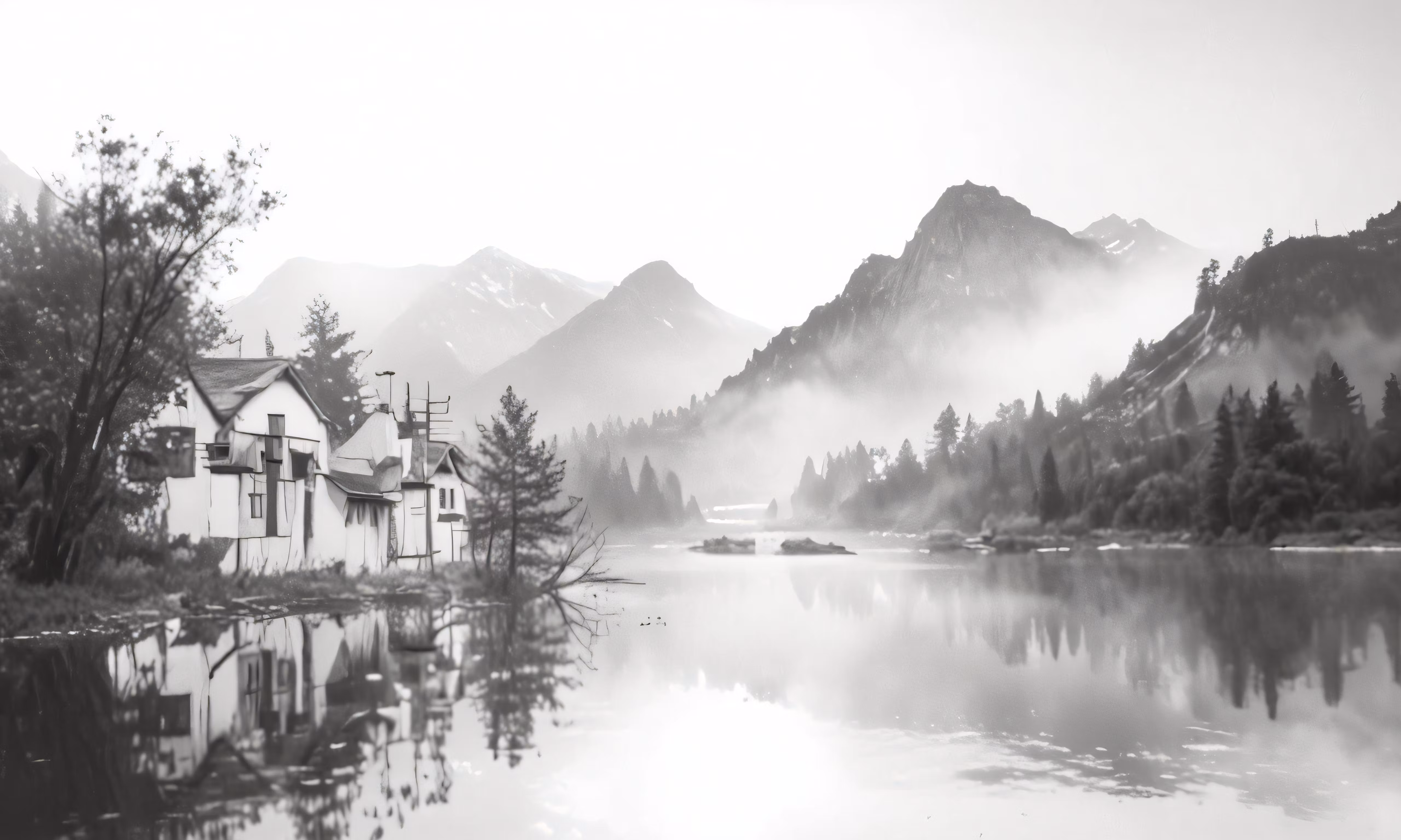High resolution picture, free to use, a black and white photo of houses in the woods