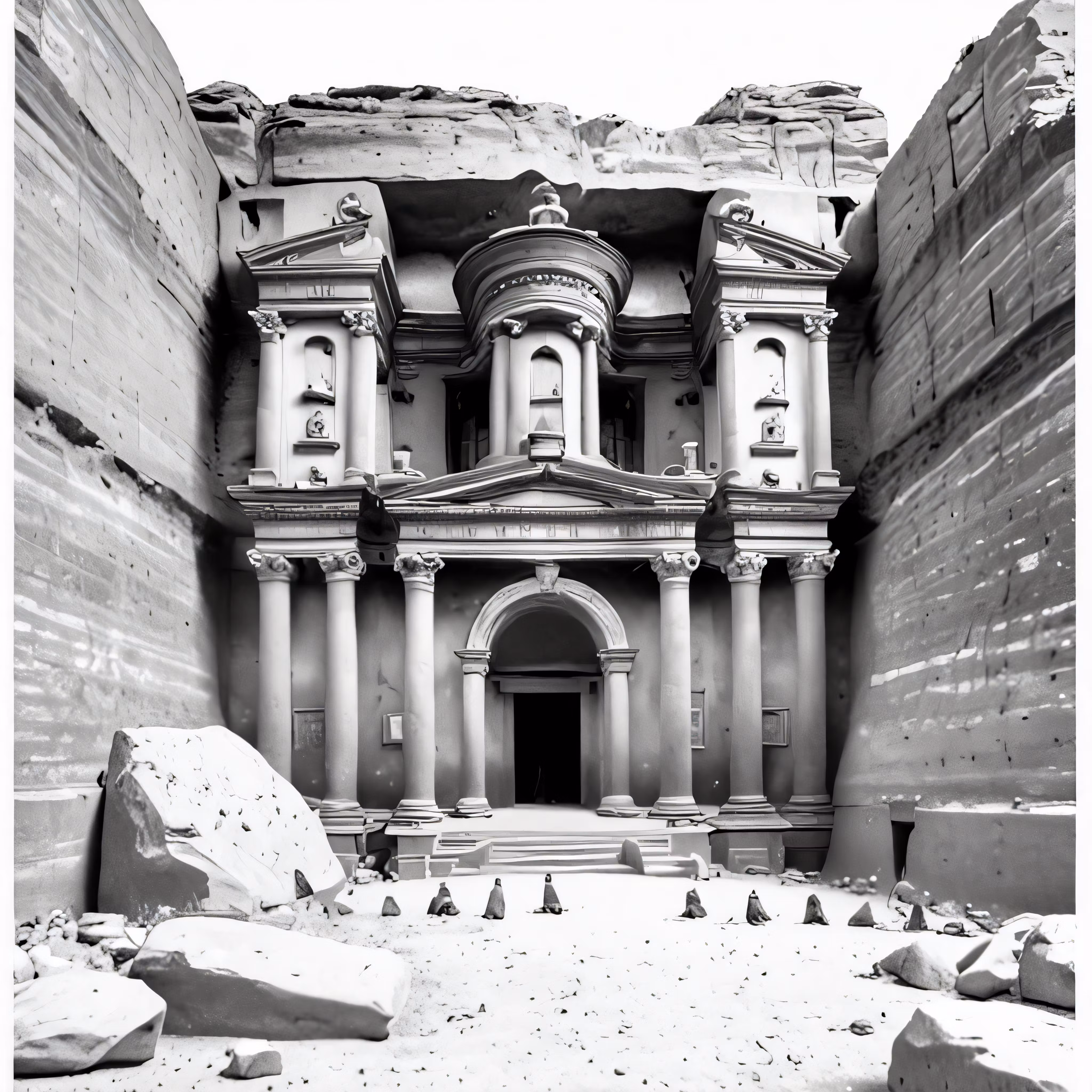 High resolution picture, free to use, a black and white photo shows a small old building with statues and arches